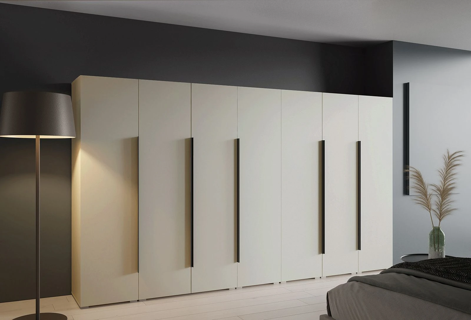 Wybór systemu ALEX to inwestycja w estetykę, która nie wyjdzie z mody przez lata. Fronty gładkie w połączeniu z szeroką paletą barw oraz opcjonalnym oświetleniem LED tworzą spójną i elegancką całość. Ta szeroka zabudowa o wymiarze 350 cm nie tylko pomieści całą Twoją garderobę, ale dzięki nastrojowemu blaskowi listew LED stanie się główną dekoracją sypialni. Wysoka jakość wykonania sprawia, że szafa otwierana ALEX to serce domu.