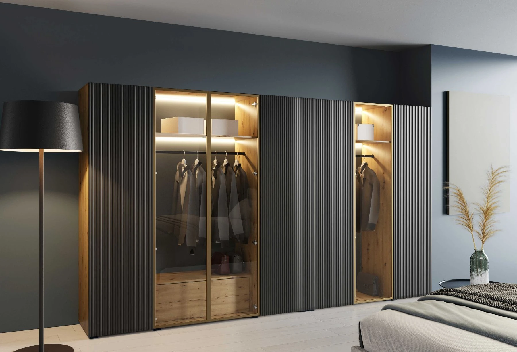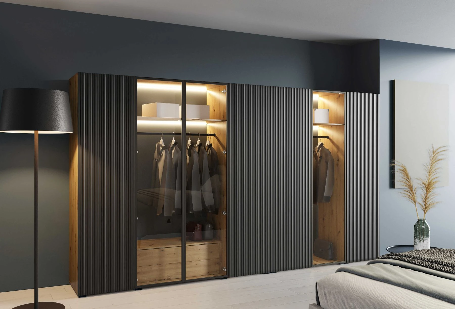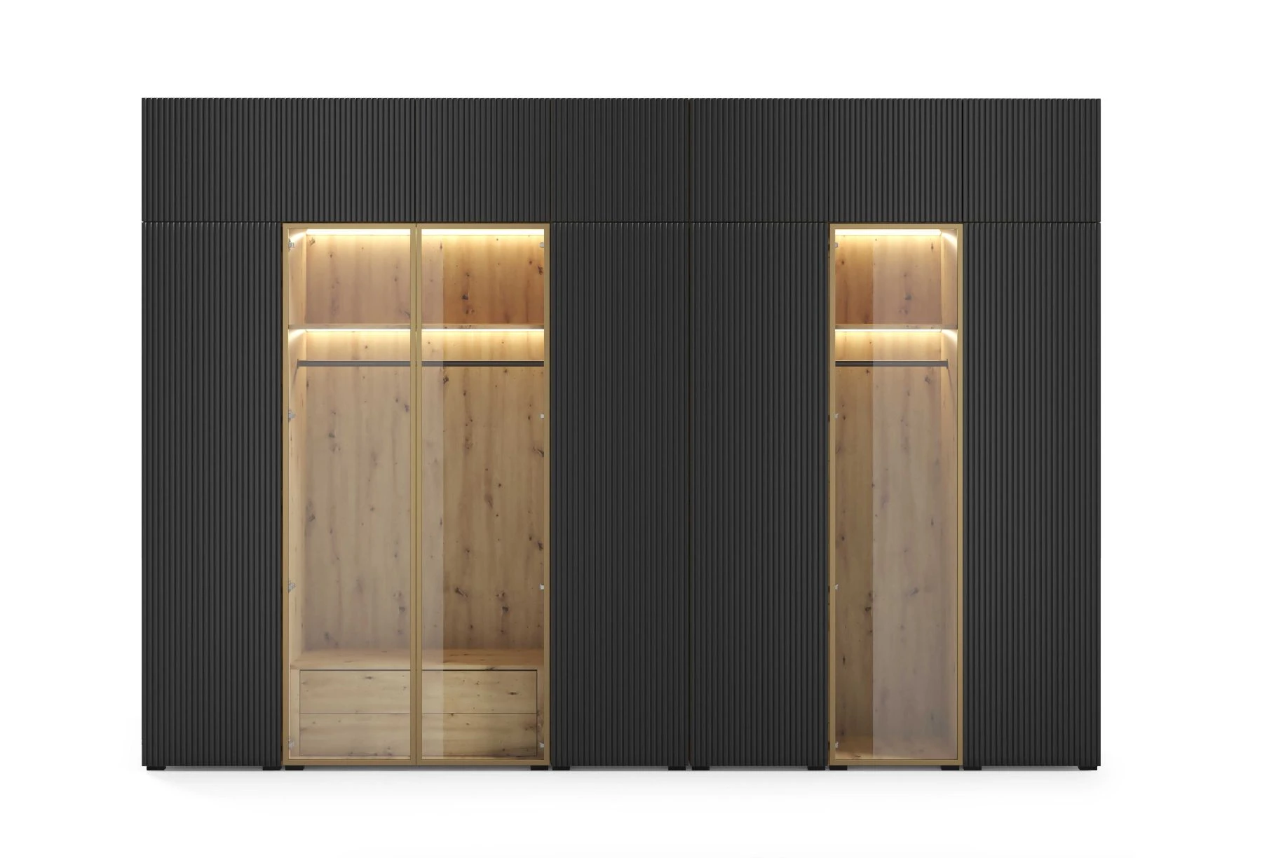 Szafa modułowa ALEX 350 cm – Czarny ryflowany front i lekkość szkła