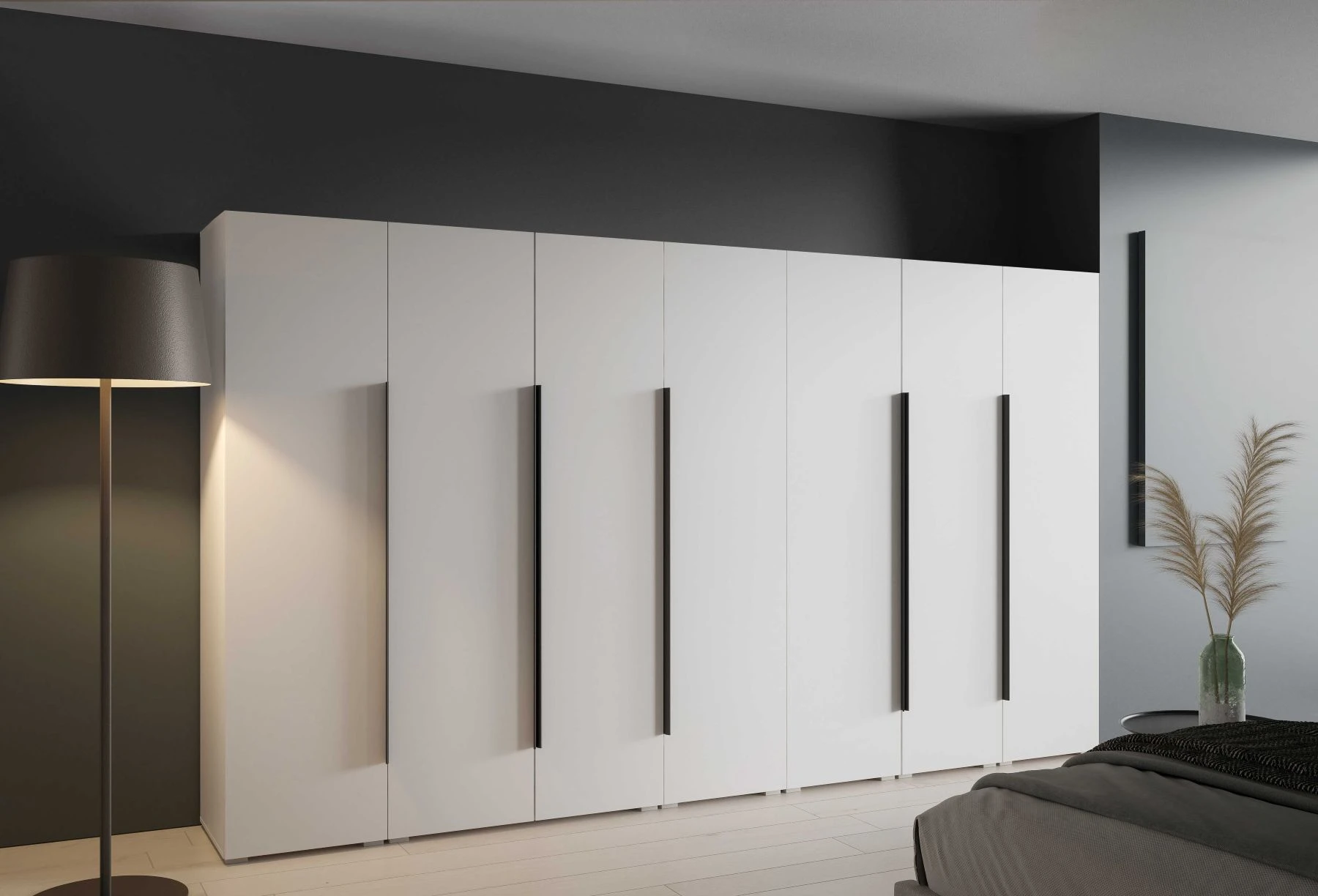 Wybór systemu ALEX to inwestycja w estetykę, która nie wyjdzie z mody przez lata. Fronty gładkie w połączeniu z szeroką paletą barw oraz opcjonalnym oświetleniem LED tworzą spójną i elegancką całość. Ta szeroka zabudowa o wymiarze 350 cm nie tylko pomieści całą Twoją garderobę, ale dzięki nastrojowemu blaskowi listew LED stanie się główną dekoracją sypialni. Wysoka jakość wykonania sprawia, że szafa otwierana ALEX to serce domu.