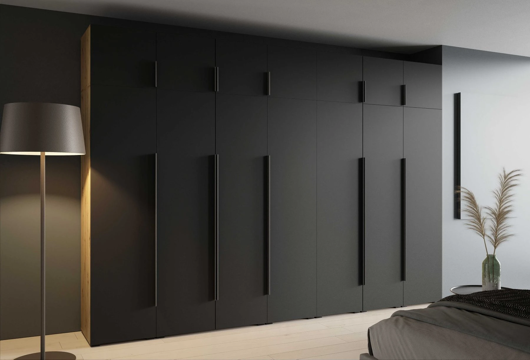 Pełna personalizacja to największy atut systemu ALEX. Możesz dowolnie modyfikować kolor korpusu oraz frontów, wybierając spośród modnych dekorów: biały mat, czarny mat, antracyt, dąb artisan lub kaszmir. Dodatkowo zestaw zawiera nadstawkę, która zmieni szafę w wysoką zabudowę o wysokości aż 245 cm. To idealny sposób na maksymalne wykorzystanie wolnego miejsca pod sam sufit w każdym nowoczesnym domu.