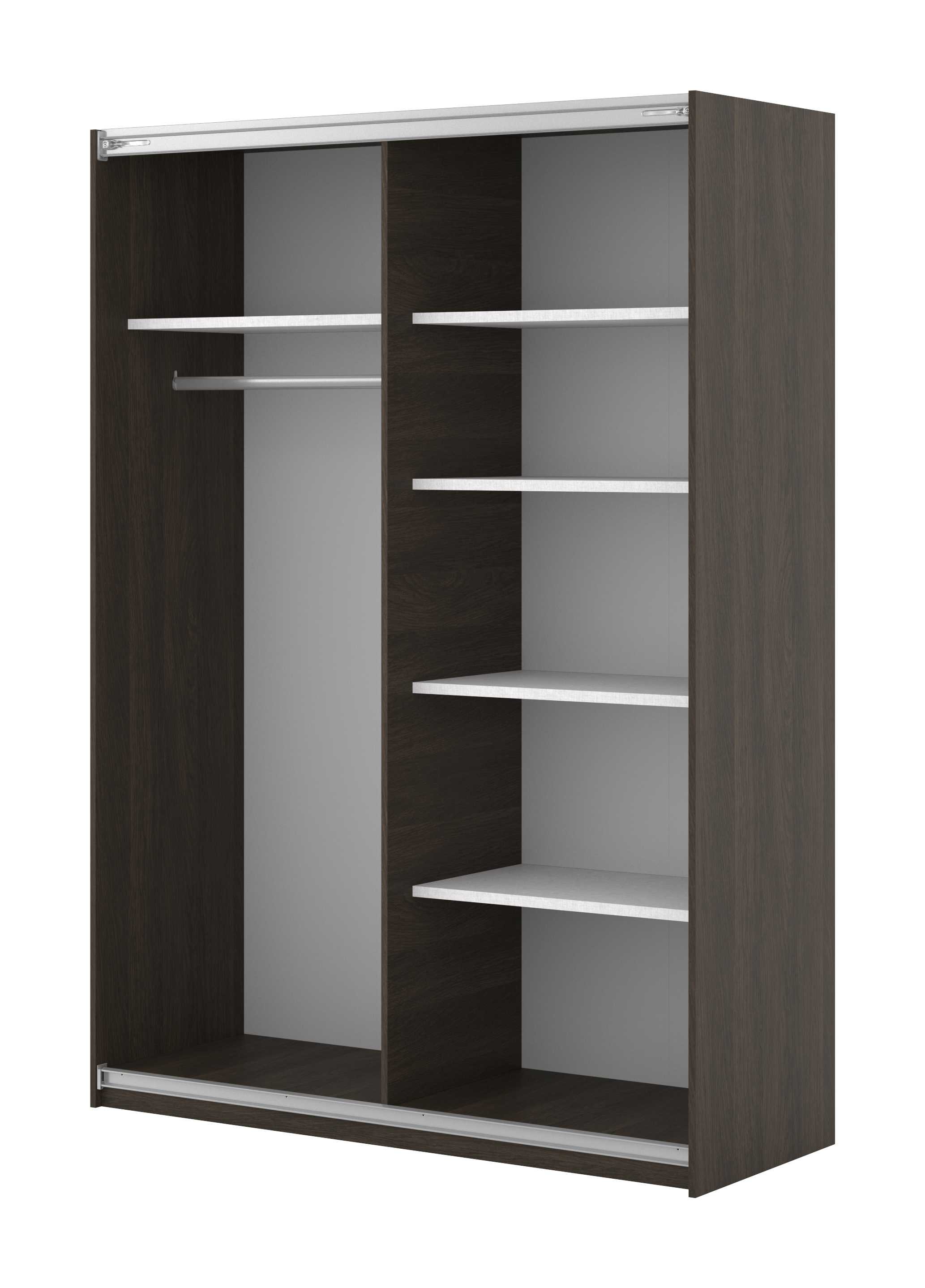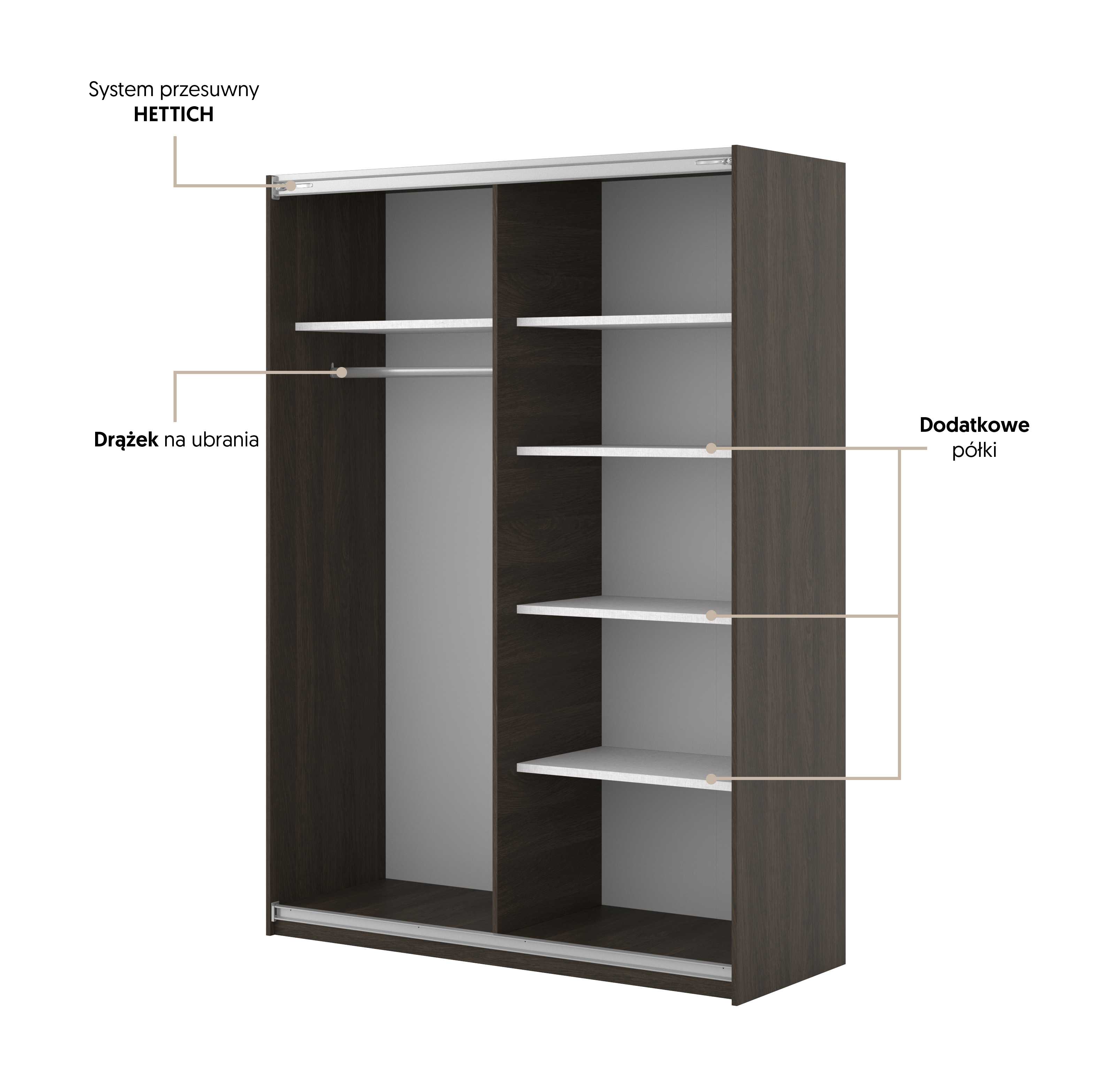 Dzięki systemowi drzwi przesuwnych szafa nie wymaga dodatkowego miejsca na otwieranie frontów, co czyni ją niezwykle wygodną także w niewielkich pomieszczeniach. Wewnątrz znajdziesz praktyczny układ półek i drążków, który pozwoli Ci uporządkować garderobę w przemyślany sposób – od sukienek i marynarek po swetry czy dodatki.