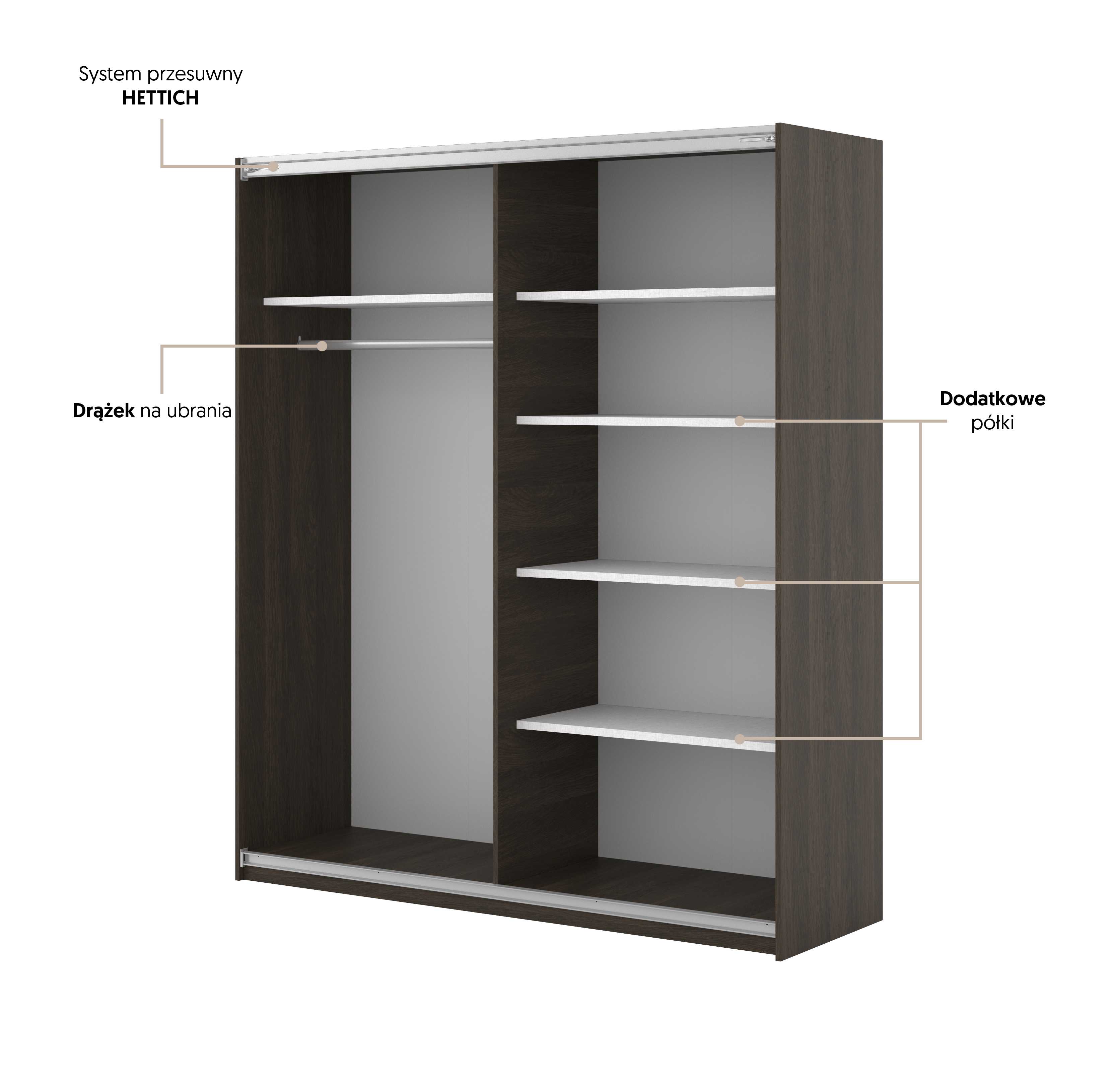 Dzięki systemowi drzwi przesuwnych szafa nie wymaga dodatkowego miejsca na otwieranie frontów, co czyni ją niezwykle wygodną także w niewielkich pomieszczeniach. Wewnątrz znajdziesz praktyczny układ półek i drążków, który pozwoli Ci uporządkować garderobę w przemyślany sposób – od sukienek i marynarek po swetry czy dodatki.