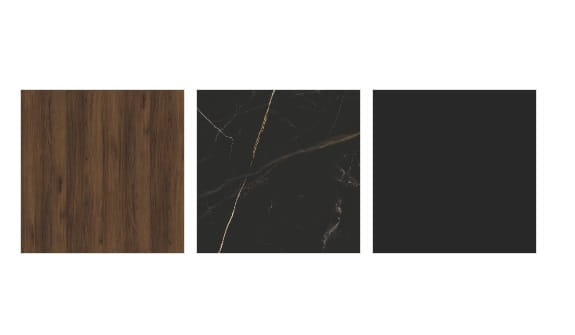 Połączenie ryflowanych frontów w kolorze czarny mat z płytą laminowaną w dekorze orzech i blatów w dekorze marmuru san sebastian nadaje kolekcji niepowtarzalny look i oryginalność wzoru.