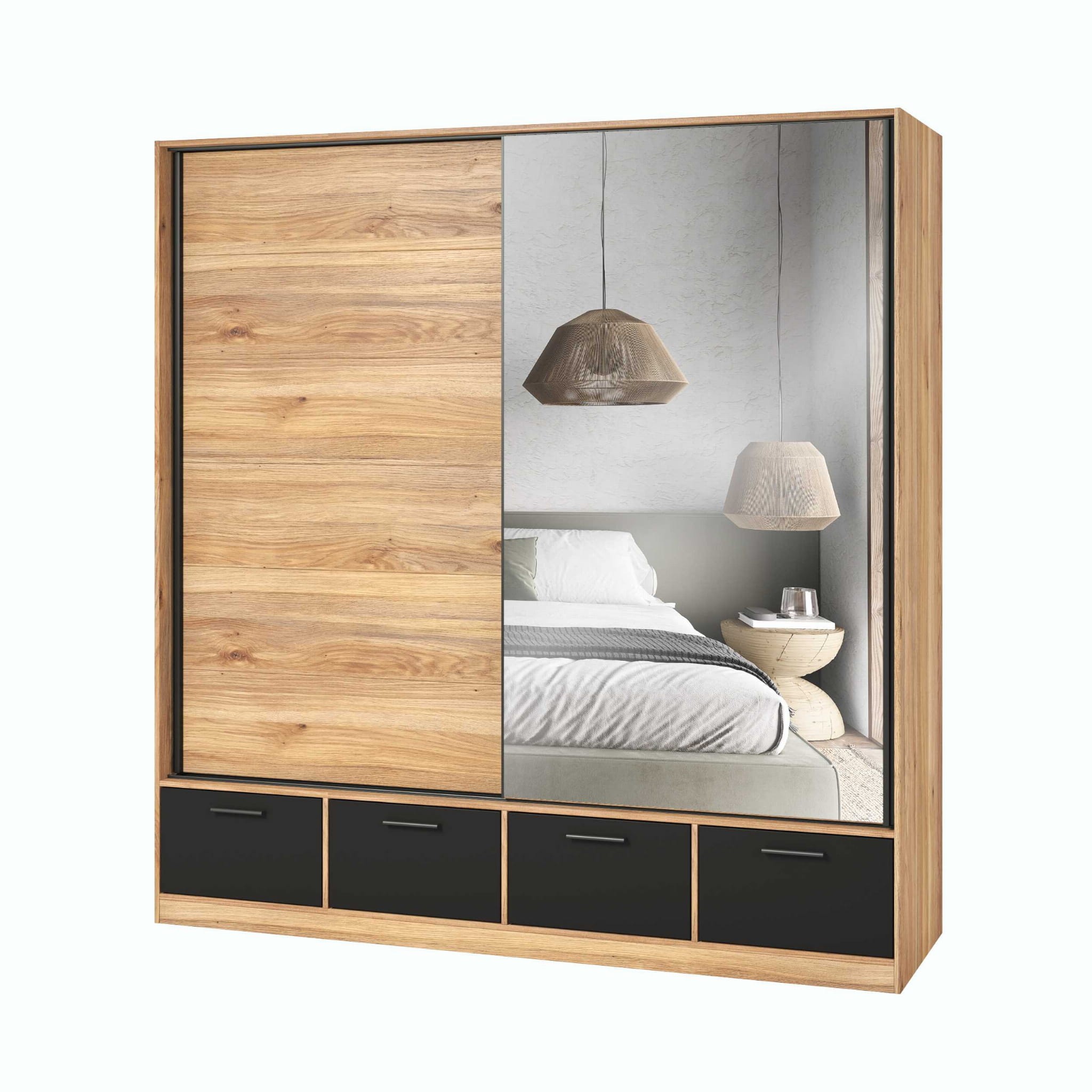 Szafa Przesuwna BETA Szerokość 200 cm Lustro Dąb Muavella z Czernią 4 - Szuflady 22MW1663