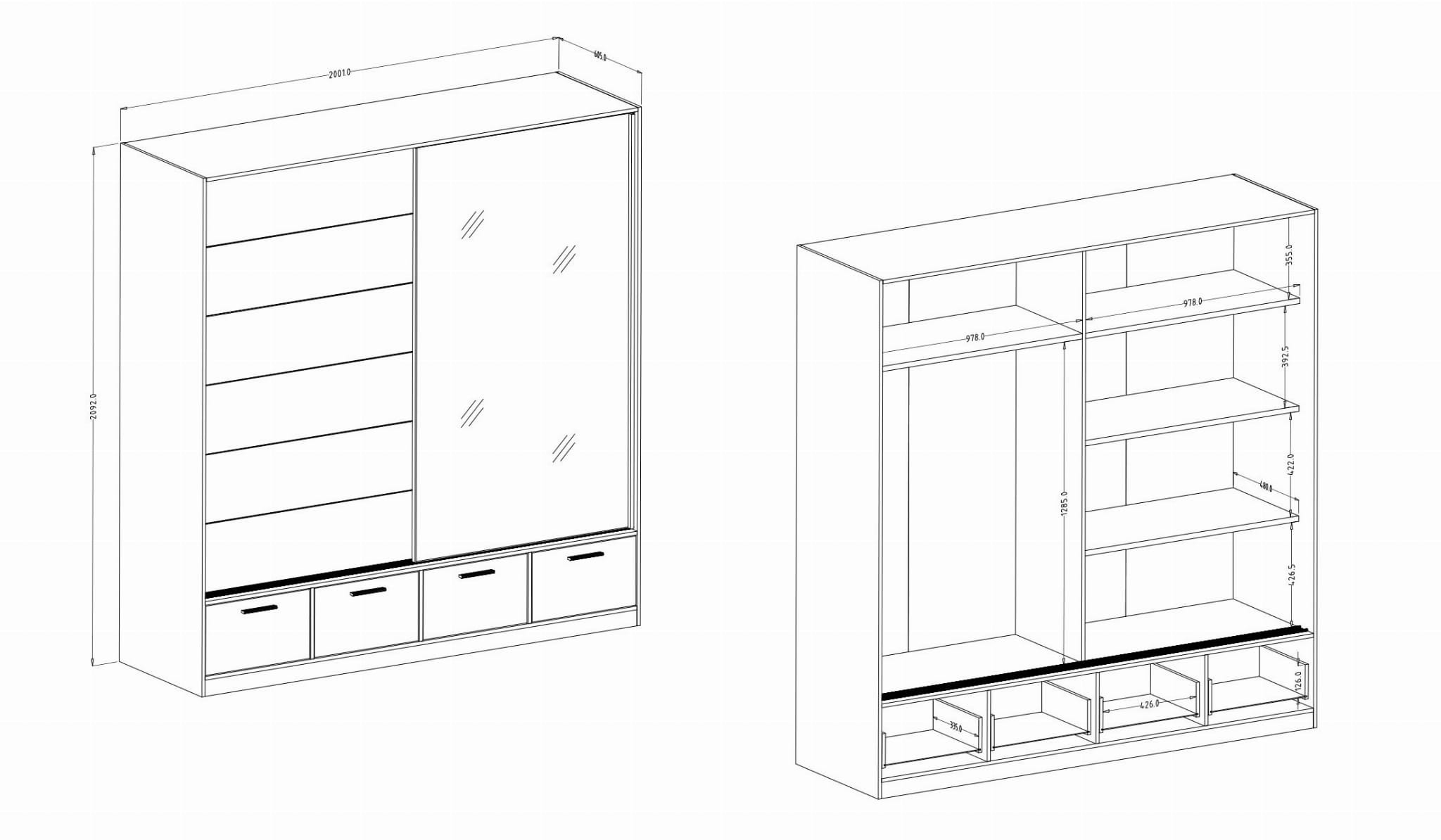 Wyposażone są w przesuwne drzwi, za którymi ukryto dwie symetryczne przestrzenie, jedną ze stałą półką konstrukcyjną oraz drążkiem na wieszaki oraz drugą z jedną stałą i trzema regulowanymi półkami.