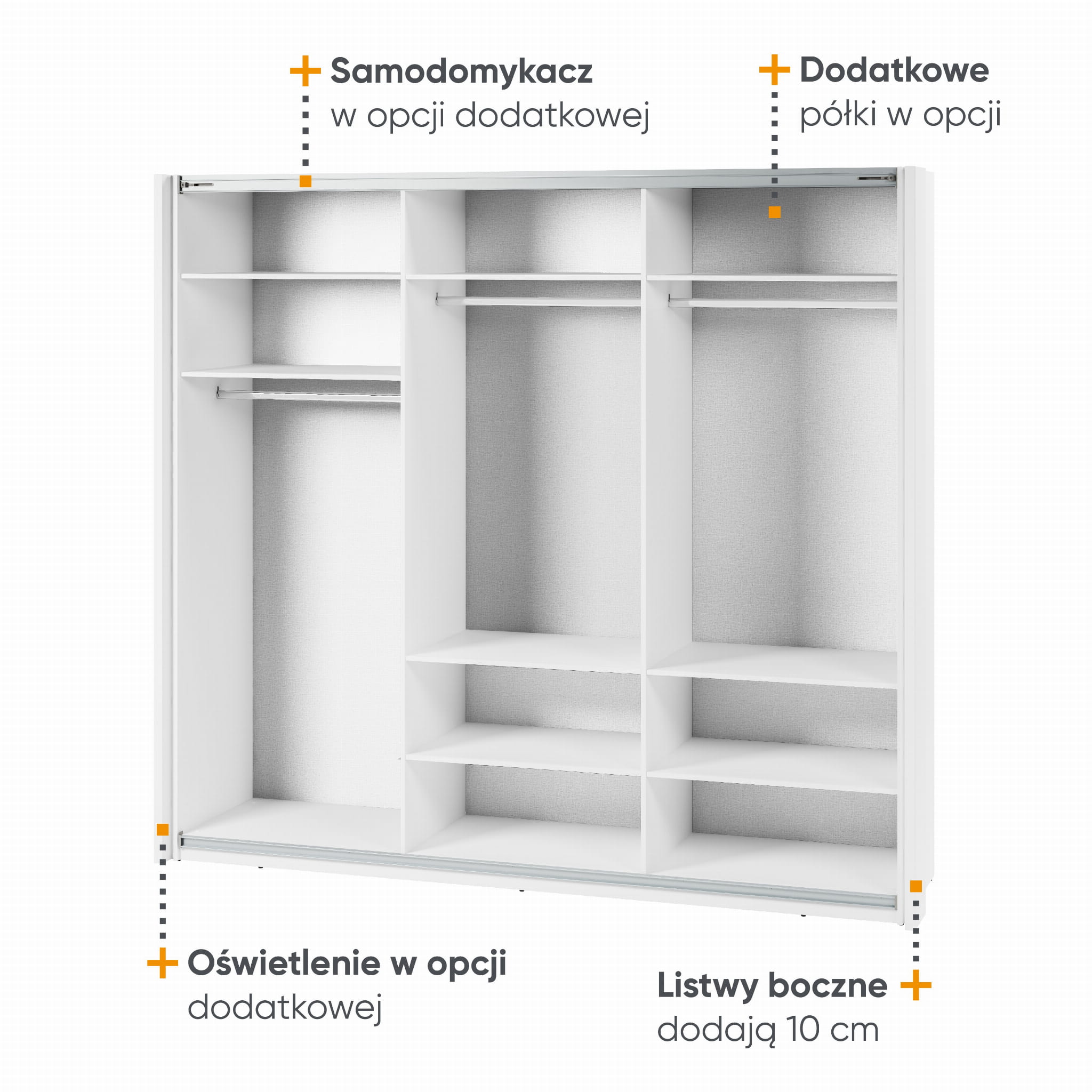 Wśród elementów dodatkowych do szafy znajdziesz: samodomykacz do drzwi przesuwnych oraz półki.