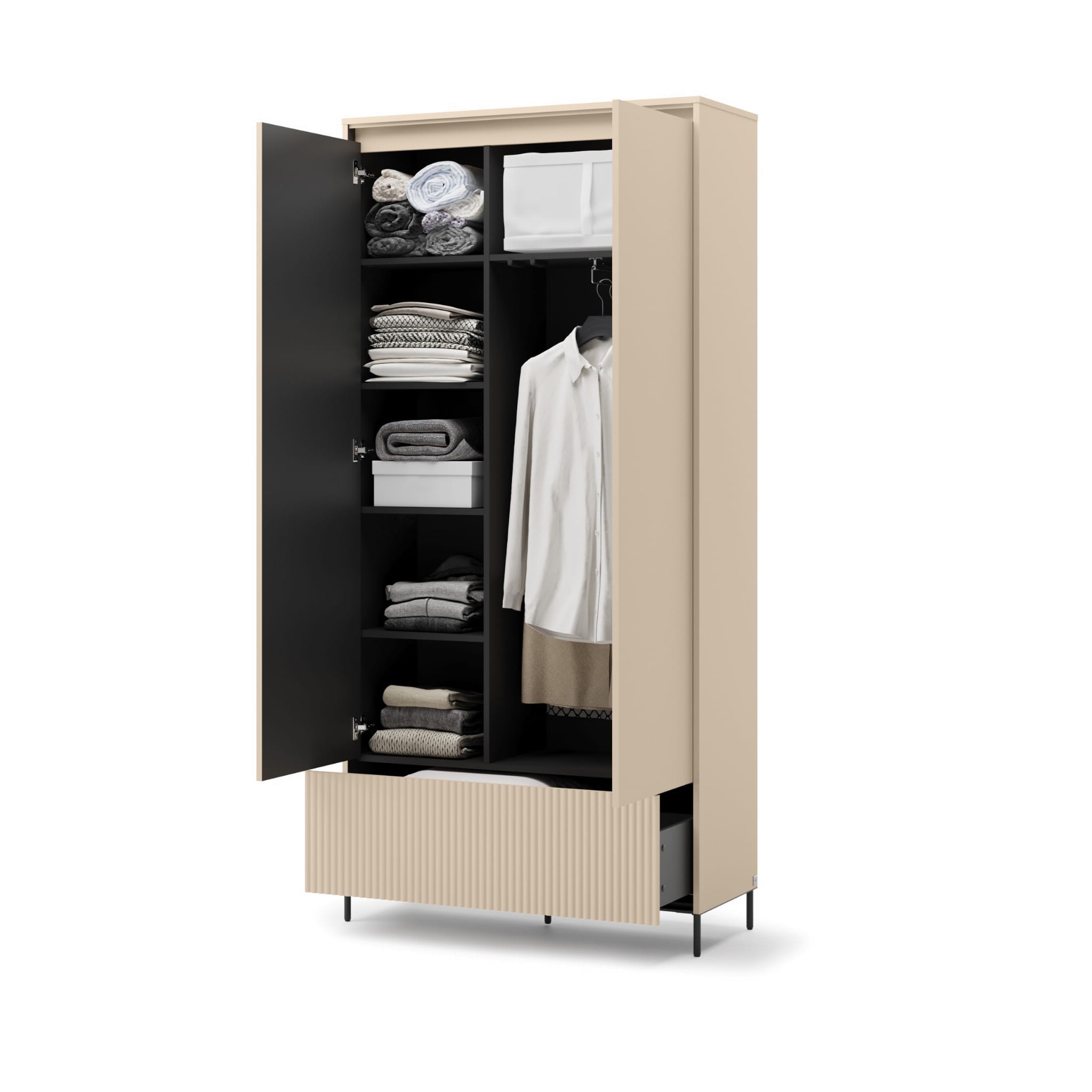Szafa TREND TG-02 Szerokość 101 cm Beż Piaskowy / Czarny Ryfle Oświetlenie LED Dwudrzwiowa Szuflada Garderoba TG2BPC