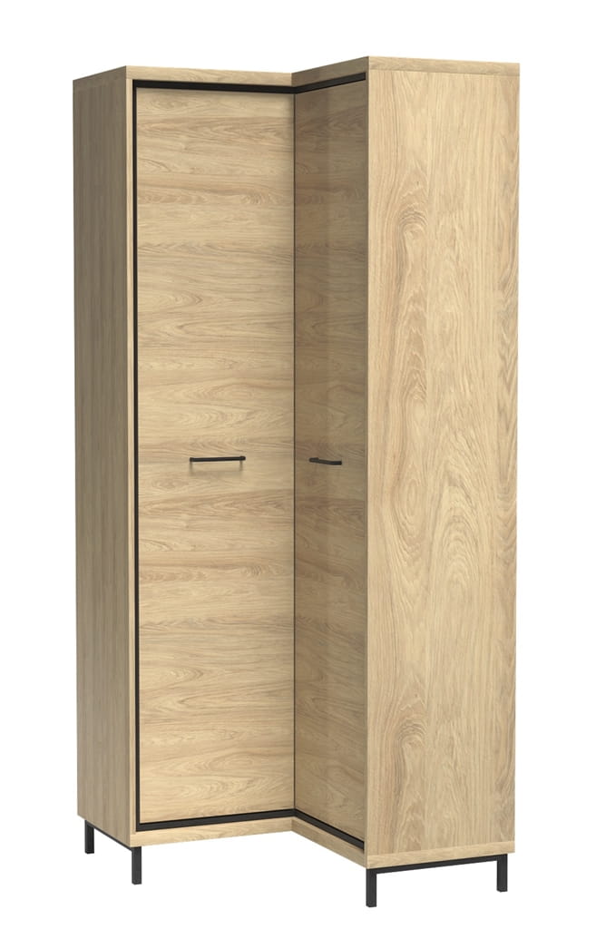 Narożna, pojemna szafa dwudrzwiowa z uchwytami do przechowywania ubrań. Dzięki opcji dodatkowych półek możemy zyskać mnóstwo miejsce. Rzadko spotykane rozwiązanie wśród szaf. Mebel w środku ma drążek do wieszania ubrań, a nad nim półkę. Szafa idealnie nada się do uzupełniania niewykorzystanego miejsca w pokoju. Kolor naturalnego drewna oraz ciemne, ozdobne listwy w stylu loftowym ocieplają wnętrze.