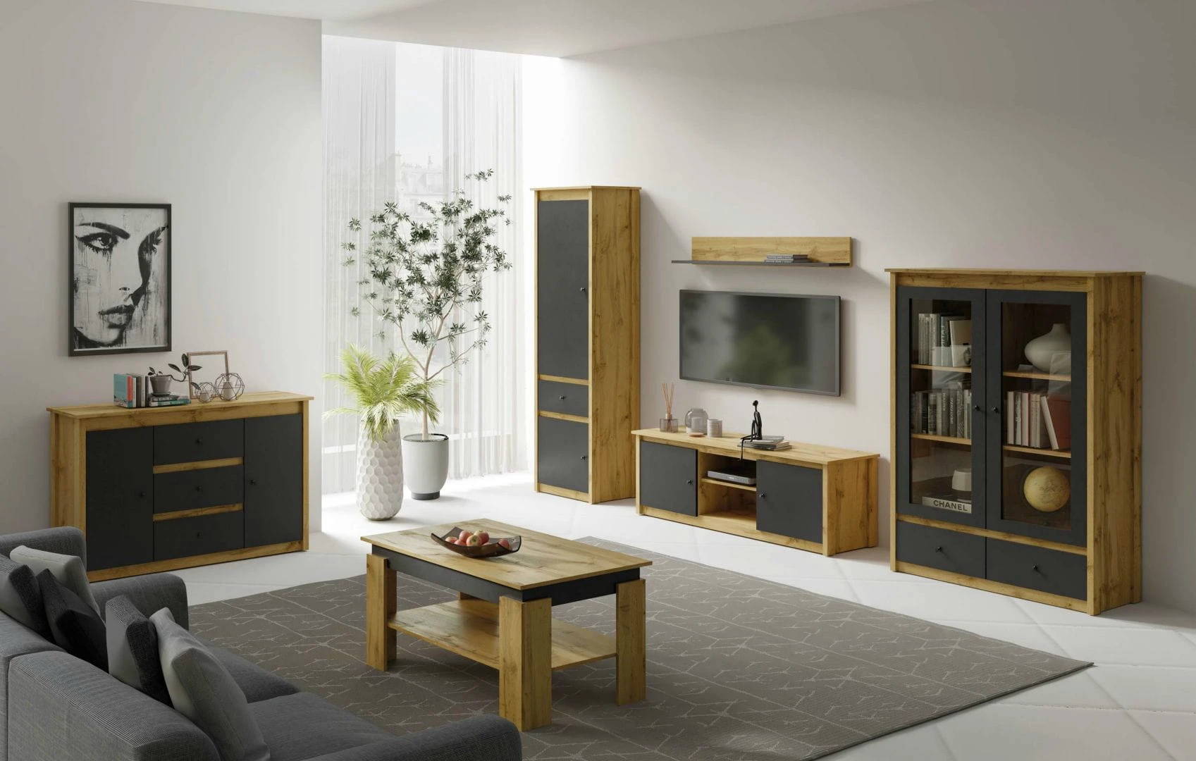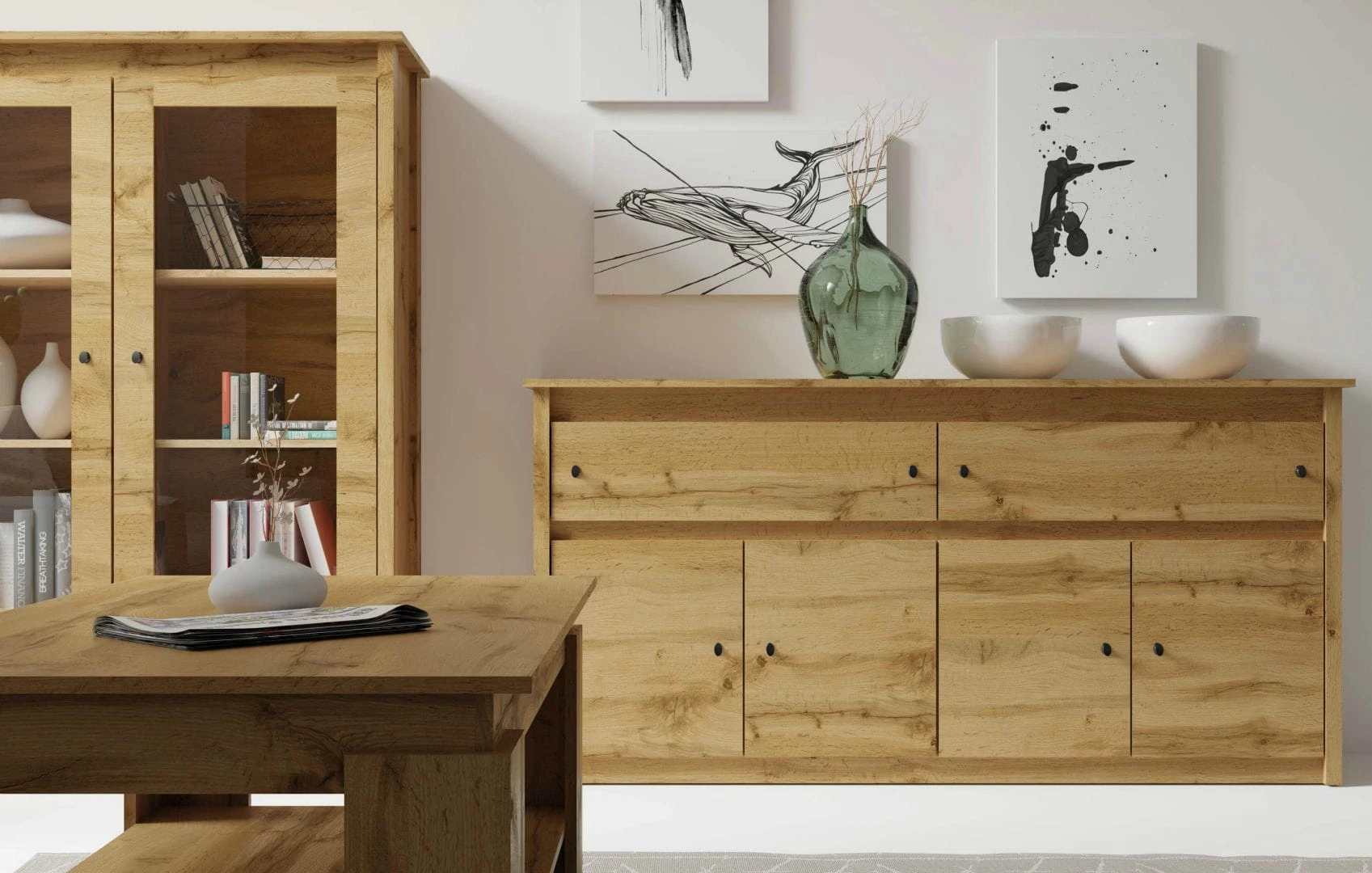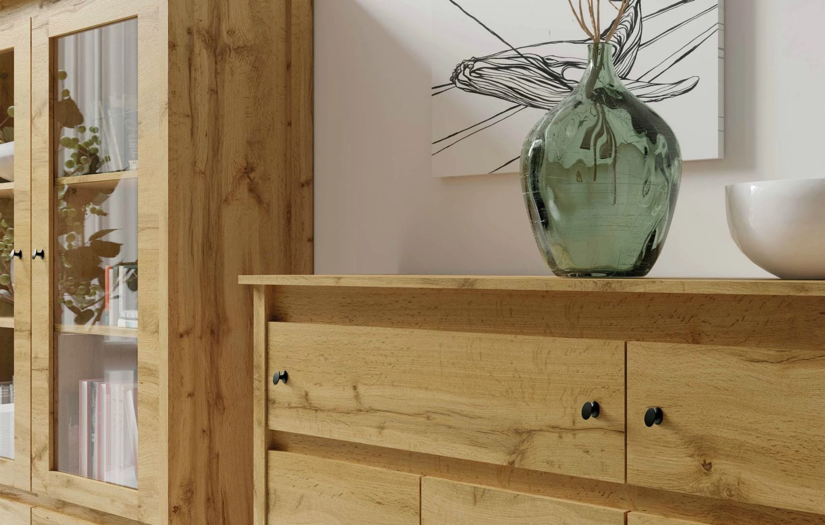 Uniwersalny system mebli Luna to połączenie funkcjonalnych brył, estetyki, wysokiej jakości wykonania oraz klasycznego stylu. Prosta forma mebli pozwala na wyeksponowanie bogatego usłojenia dekoru dąb wotan w zastosowanej płycie laminowanej 3D, minimalistyczne uchwyty w postaci gałek są dopełnieniem zamierzonego designu.