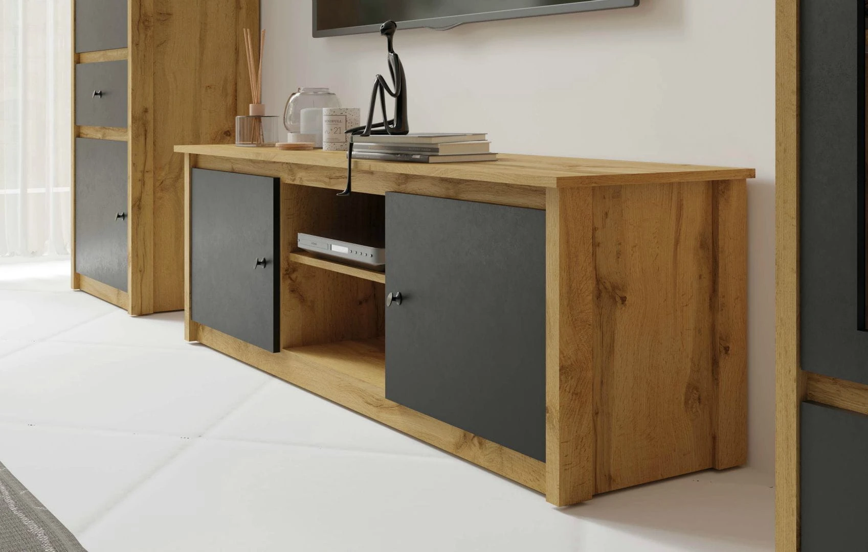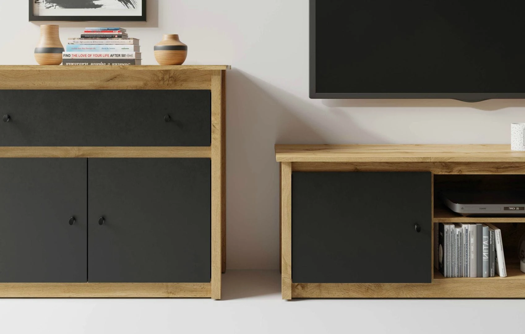 System Luna jest dostępny w dwóch wariantach kolorystycznych: dąb wotan i czarny + dąb wotan. Ciepły naturalny kolor dekoru drewna potrafi stworzyć niesamowity klimat i unikalną aranżację przytulnego wnętrza. Jeżeli jesteś zwolennikiem mocniejszych akcentów połączenie czerni z dębem wotan będzie doskonałym rozwiązaniem.