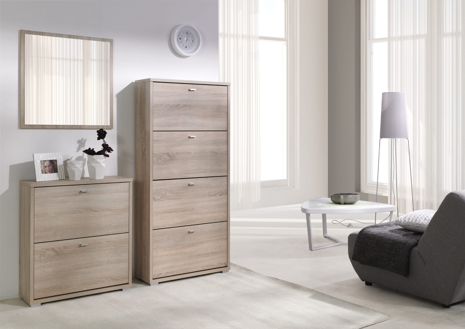 Szafki na buty występują w 3 wariantach wielkościowych oraz trzech kolorach neutralna biel, antracyt oraz klasyczny dąb sonoma.