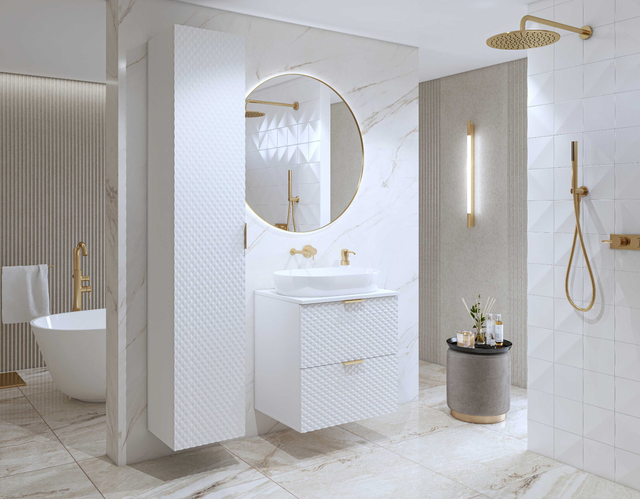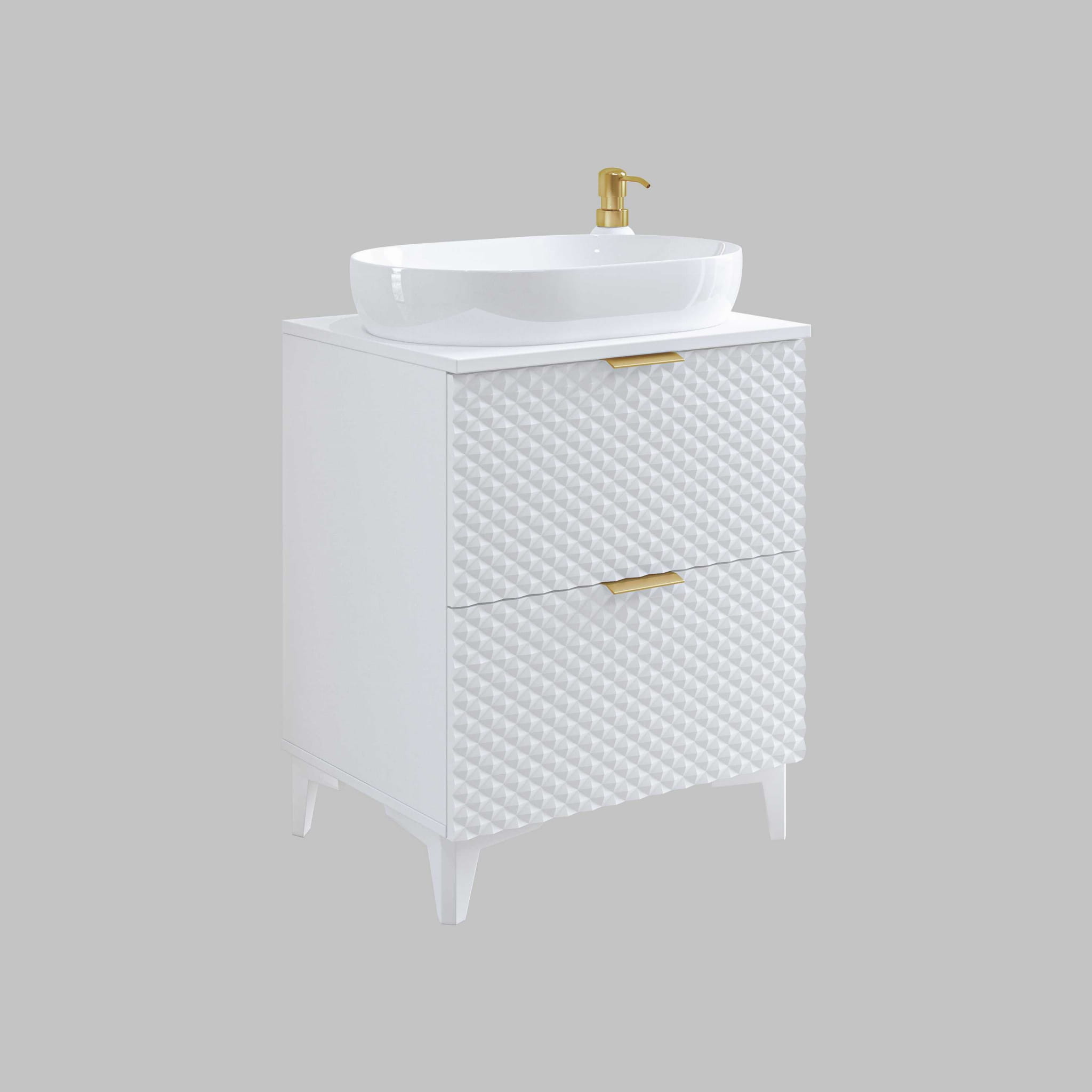 Czarne meble do łazienki stają się coraz popularniejsze w nowoczesnych wnętrzach. W wersji z ryflowanymi frontami i złotymi uchwytami prezentują się niezwykle elegancko i nowocześnie. Białe meble łazienkowe z kolekcji LAURA są świetnym rozwiązaniem do mniejszych przestrzeni, w których zależy Ci na optycznym powiększeniu wnętrza. Złote uchwyty i ryflowania w kształcie piramidek dodają im oryginalności.