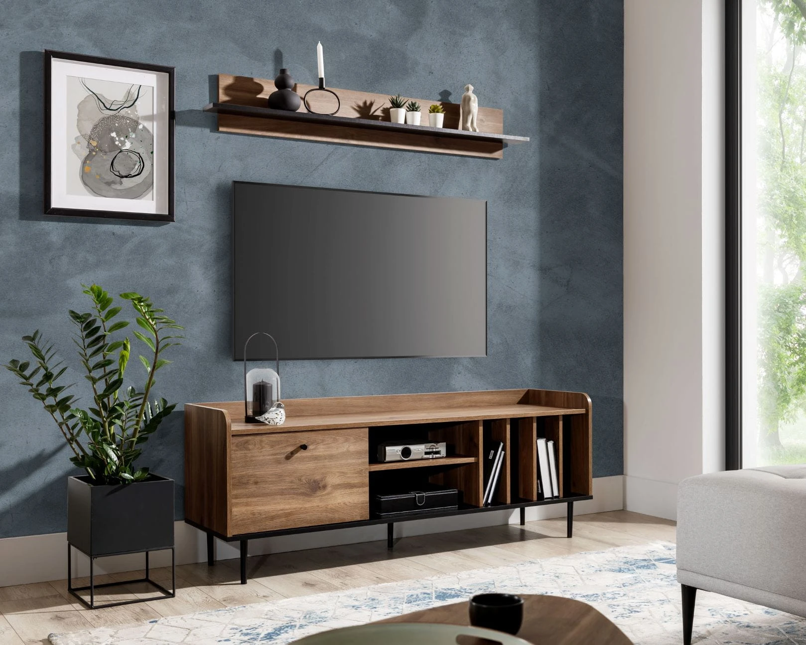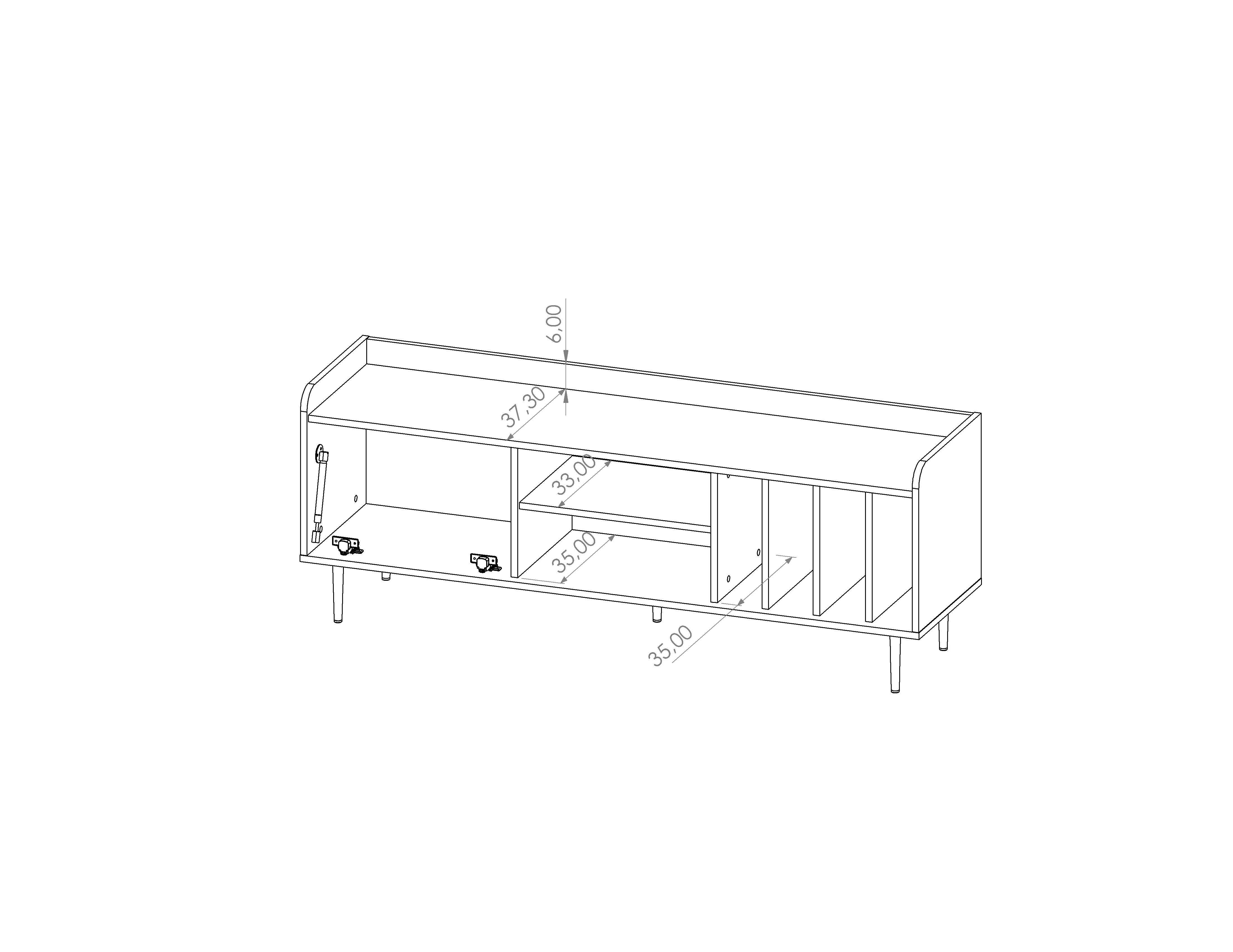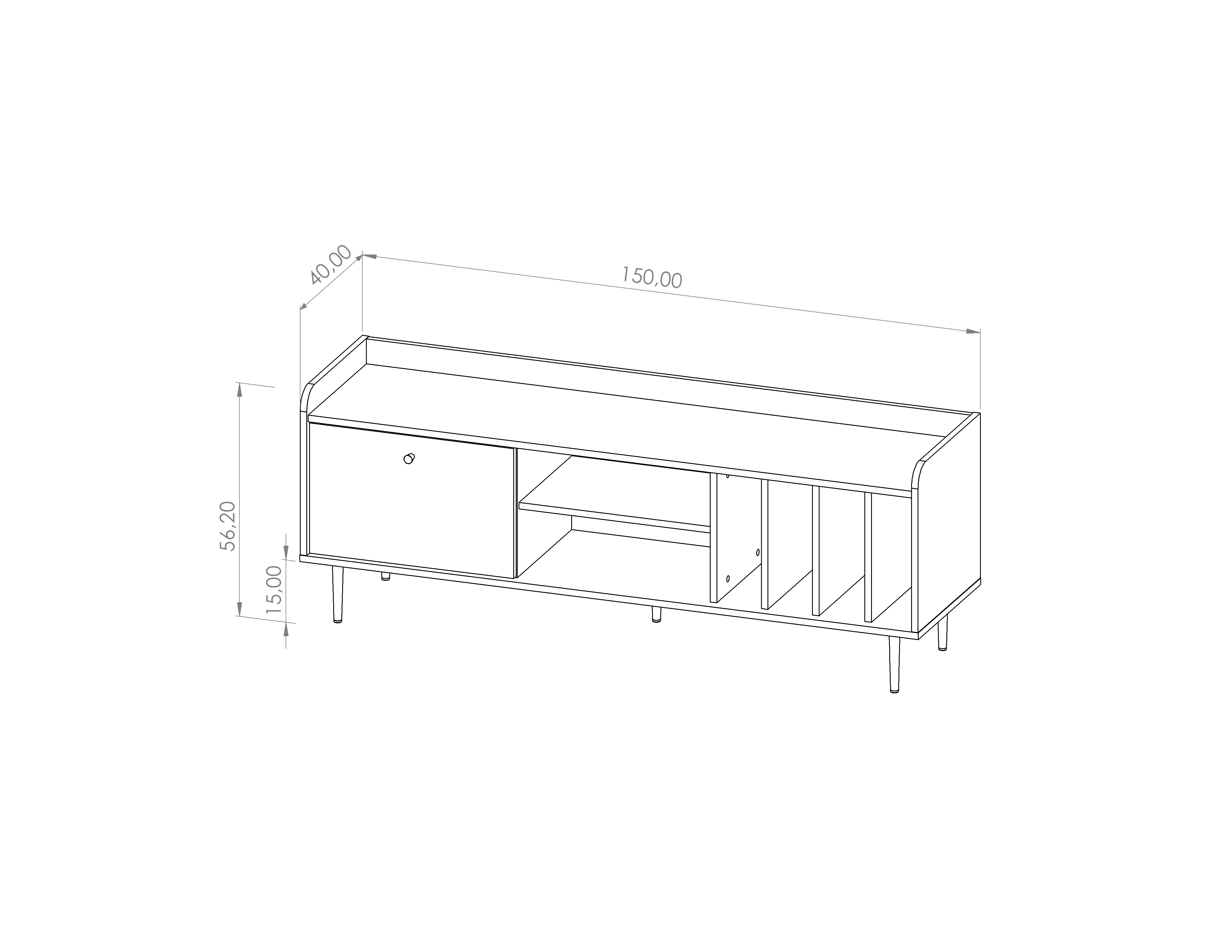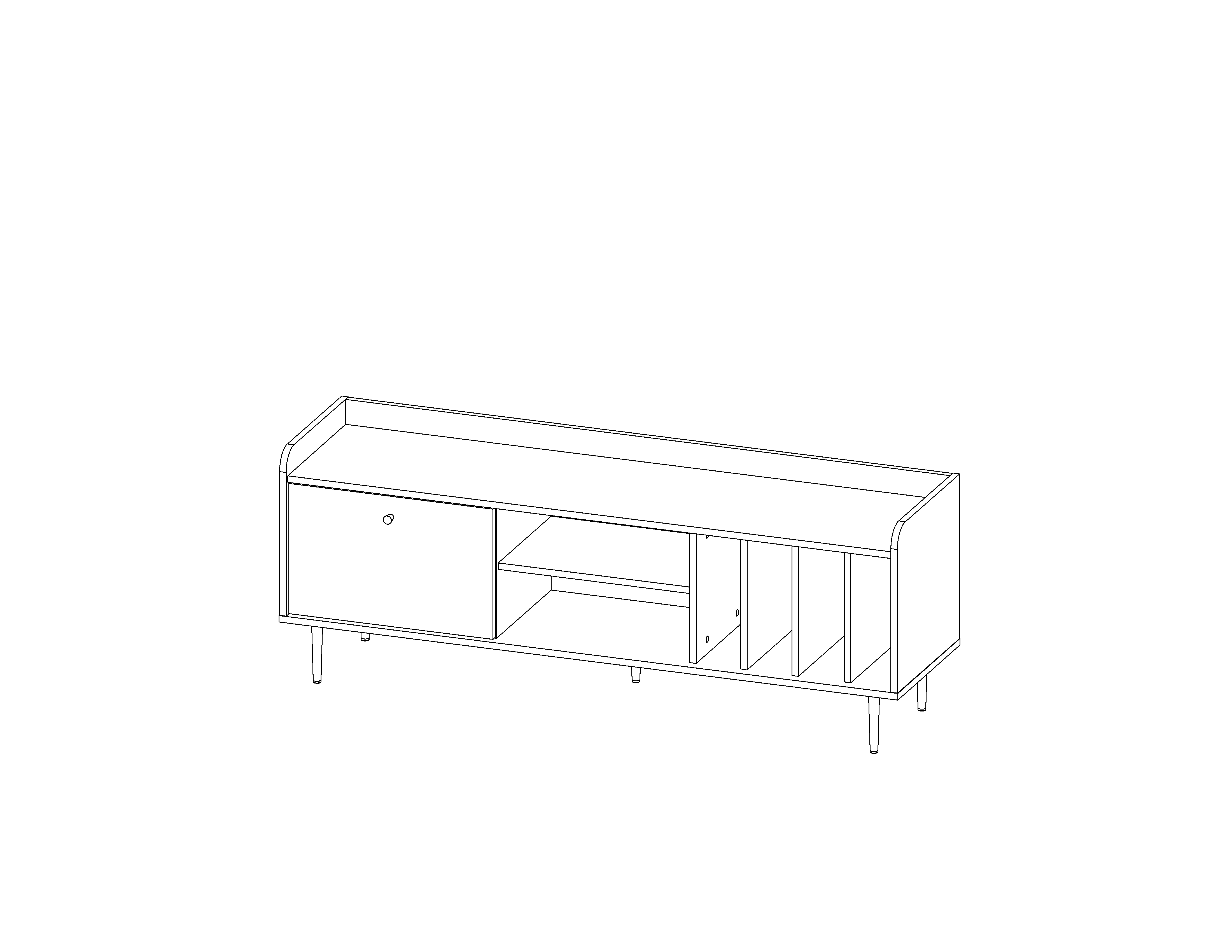 Szafka RTV ma szerokość 150 cm, posiada półkę na sprzęt RTV z dwoma przestrzeniami, oraz szafkę otwieraną w dół na siłowniku gazowym.
