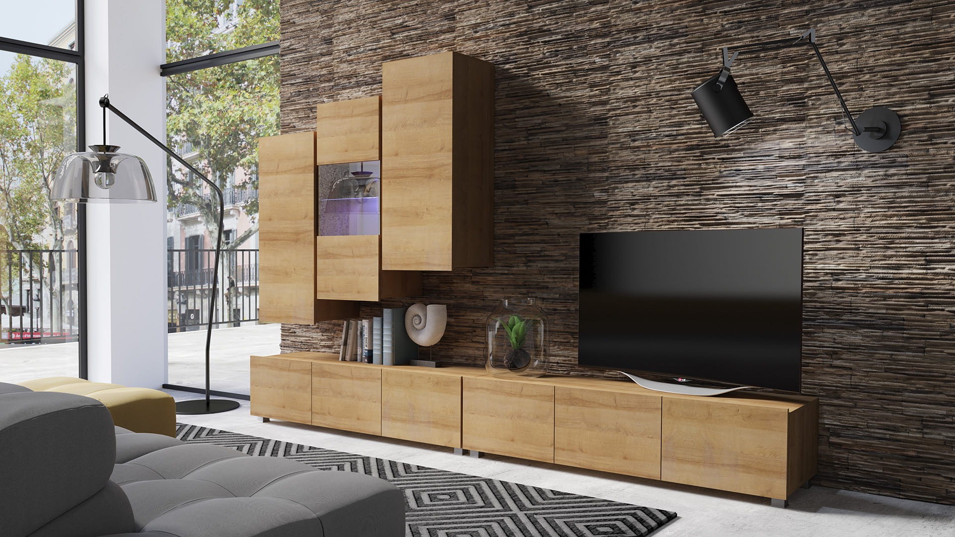 Cechą charakterystyczną prezentowanej kolekcji jest brak uchwytów w szafkach, a także możliwość swobodnego ustawienia meblościanki w zależności od indywidualnych preferencji i potrzeb.
