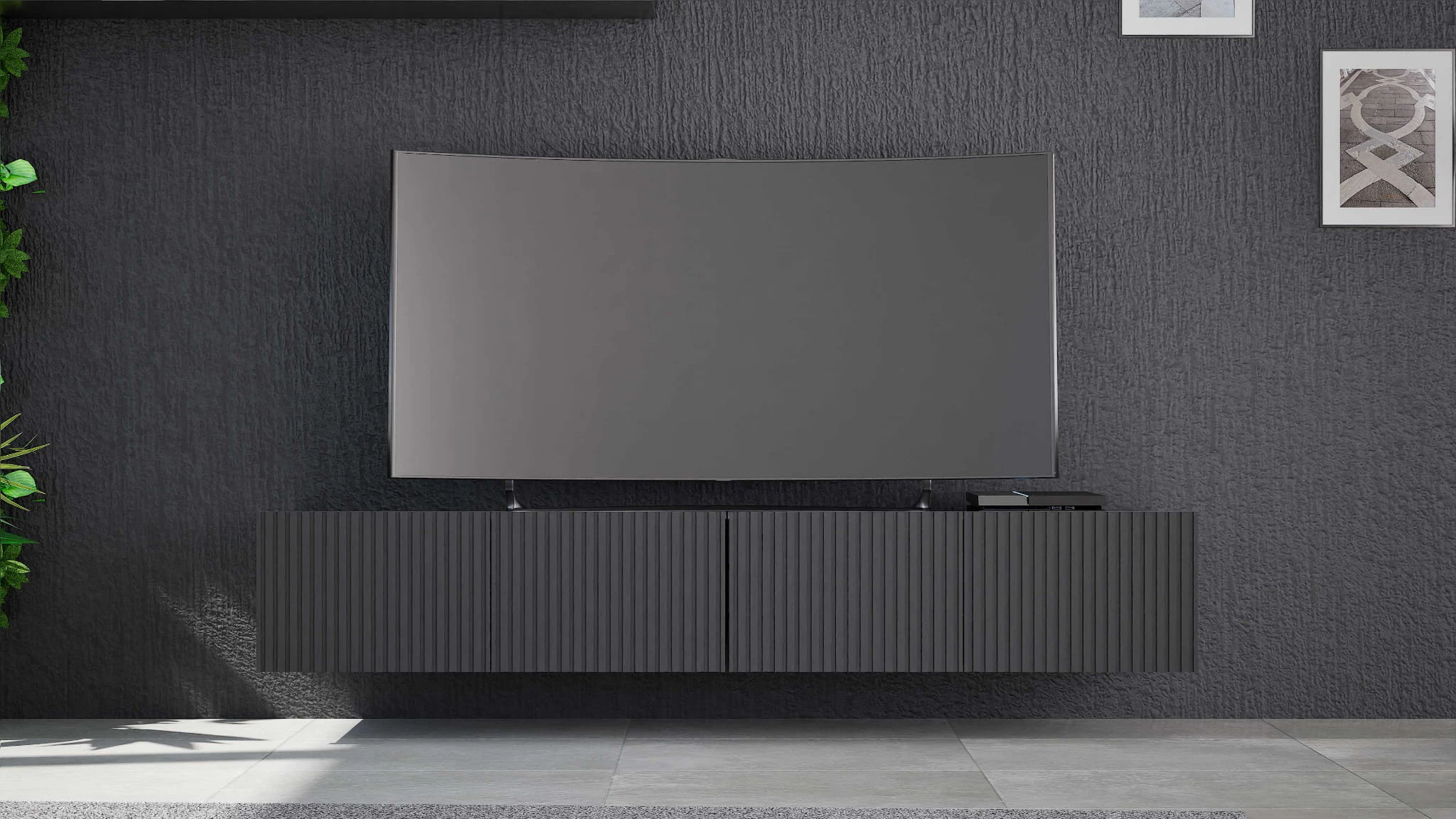 Szafka RTV Czarna 200 cm Do Salonu Wisząca Czarny Mat Ryflowany Front KOLDER KL-01-CZM