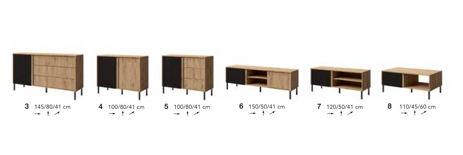 Zestaw mebli MIA nie tylko inspiruje, ale dostarcza również gotowych rozwiązań do sypialni. W jego skład wchodzą komody o różnych wymiarach i konfiguracjach, a także szafki RTV oraz stolik kawowy.