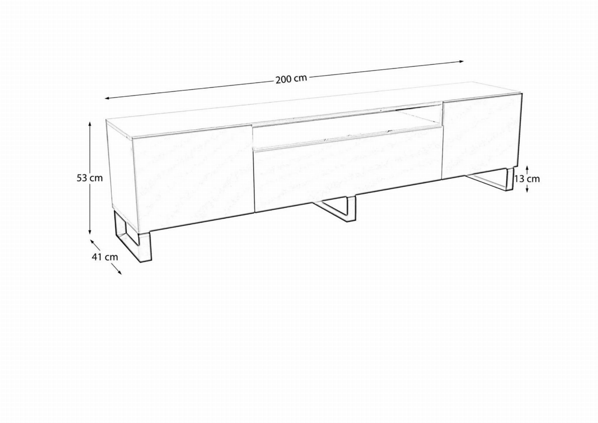 Nowoczesna szafka RTV do salonu o szerokości 200 cm, wysokości 53 cm i głębokości 41 cm, idealnie sprawdzi się w każdym salonie czy też pokoju.