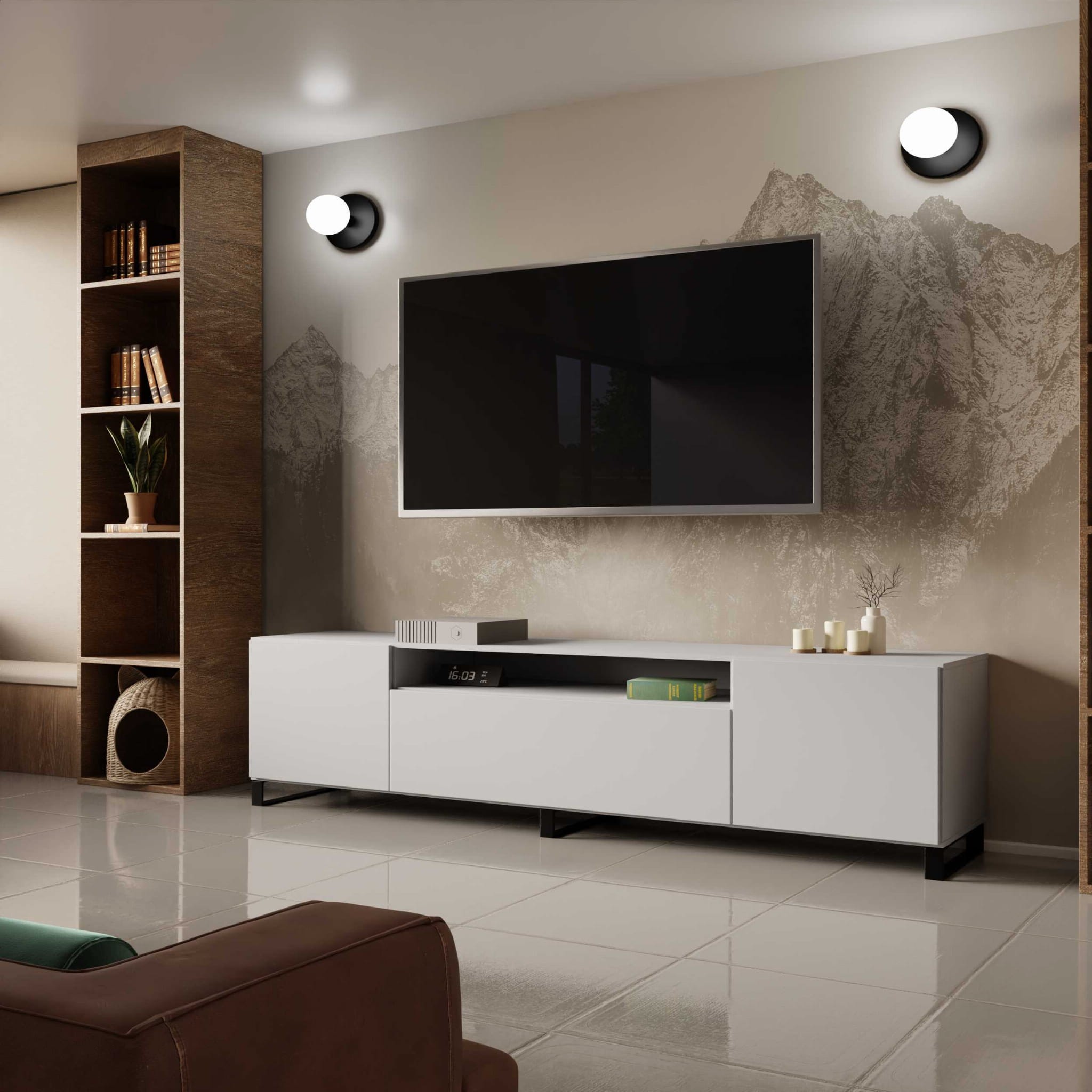 Korpus szafki RTV jest wykonany z wytrzymałej płyty laminowanej o grubości 16 mm, natomiast fronty z płyty MDF o grubości 18 mm, posiada system otwierania PUSH TO OPEN oraz czarne nóżki o wysokości aż 13 cm co umożliwia utrzymanie porządku pod meblem.
