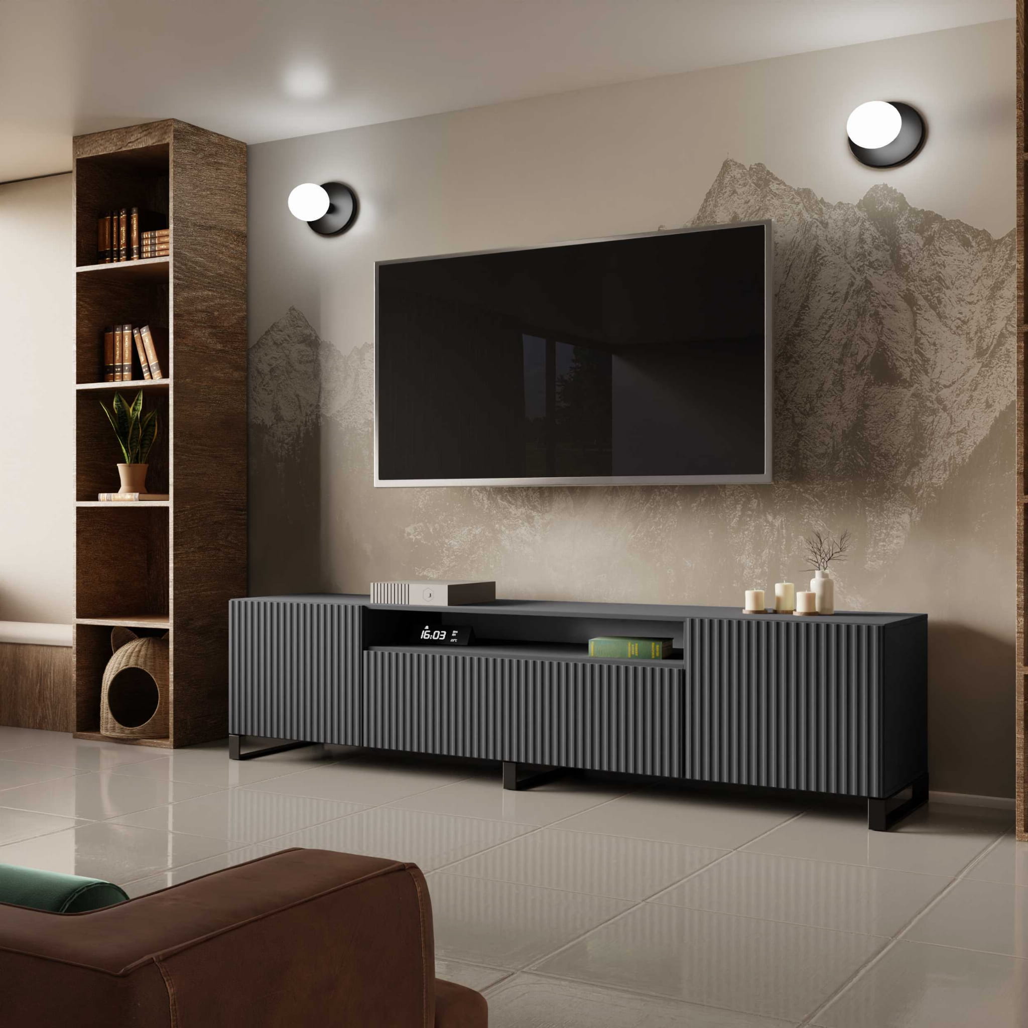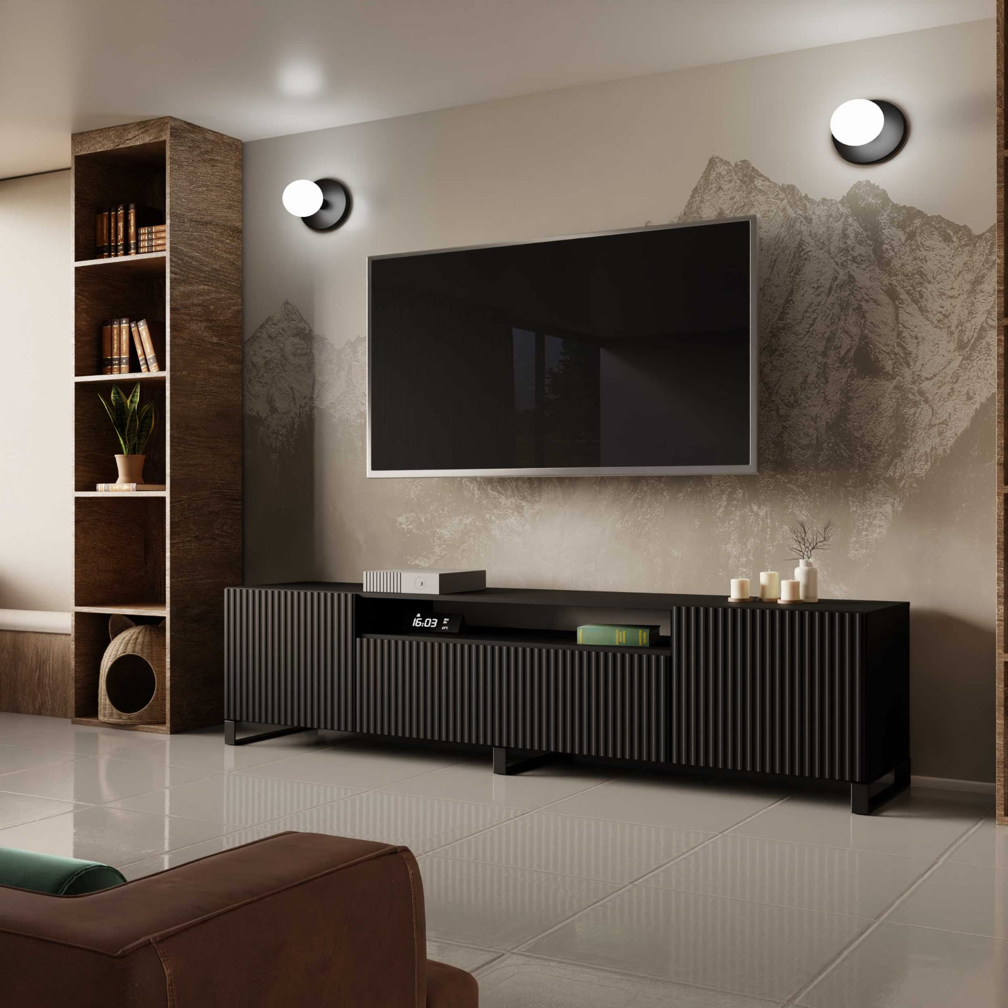 Korpus szafki RTV jest wykonany z wytrzymałej płyty laminowanej o grubości 16 mm, natomiast ryflowane fronty z płyty MDF o grubości 18 mm, posiada system otwierania PUSH TO OPEN oraz czarne nóżki o wysokości aż 13 cm co umożliwia utrzymanie porządku pod meblem.
