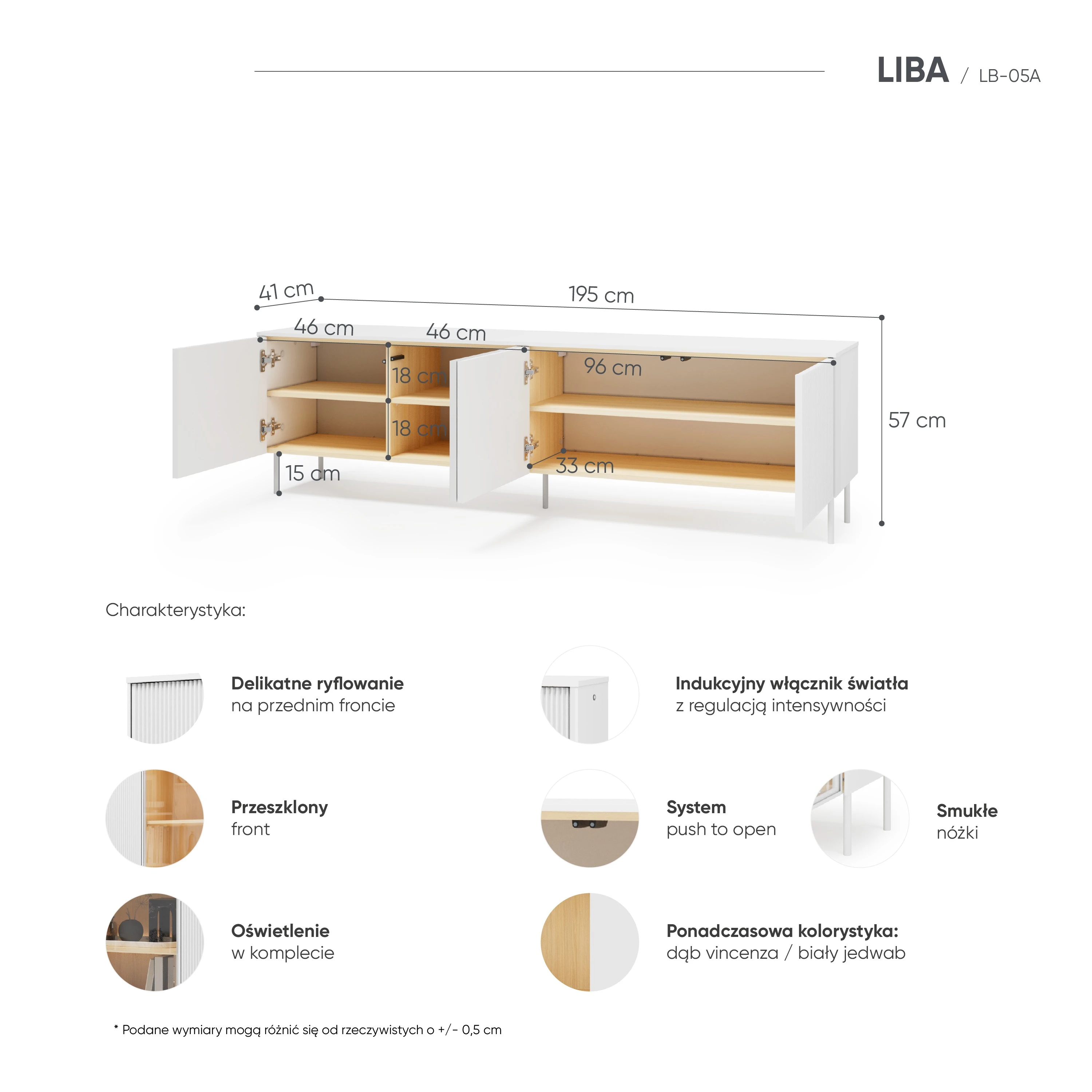 Szafka RTV Stojąca z Przeszkleniem Do Salonu Biała + Dąb Vincenza Szerokość 195 cm LIBA LB-05A LB5ABJDV