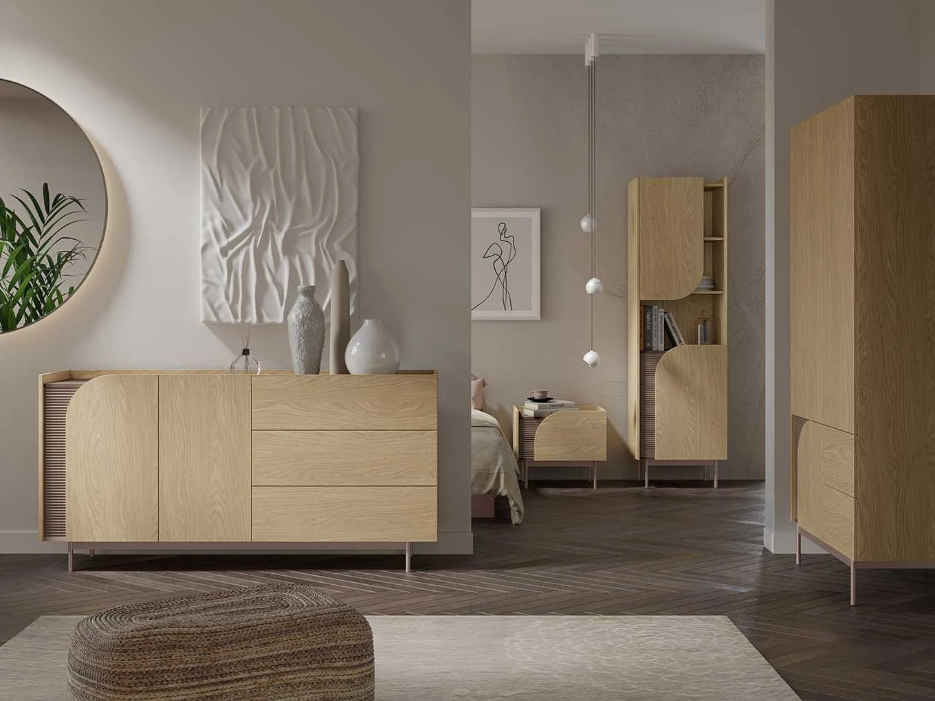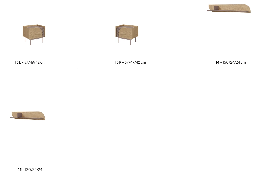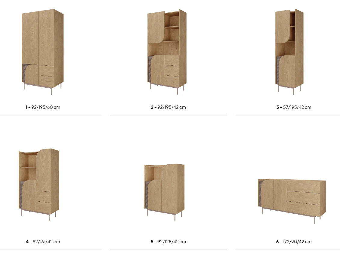 Kolekcja została zaprojektowana z myślą o pełnej aranżacji wnętrza. W jej skład wchodzą: szafa, regały, komody, szafki RTV, stolik kawowy, półki wiszące, toaletka oraz szafki nocne, co pozwala stworzyć funkcjonalne i estetyczne wnętrze dopasowane do indywidualnych potrzeb. Każdy element kolekcji łączy w sobie praktyczność i wyjątkowy wygląd.