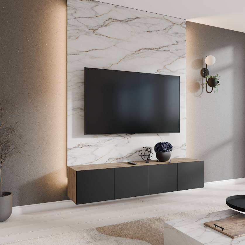 Korpus szafki RTV jest wykonany z wytrzymałej płyty laminowanej o grubości 16 mm, natomiast fronty z płyty MDF o grubości 18 mm, posiada system otwierania PUSH TO OPEN oraz występuje w wersji wiszącej.