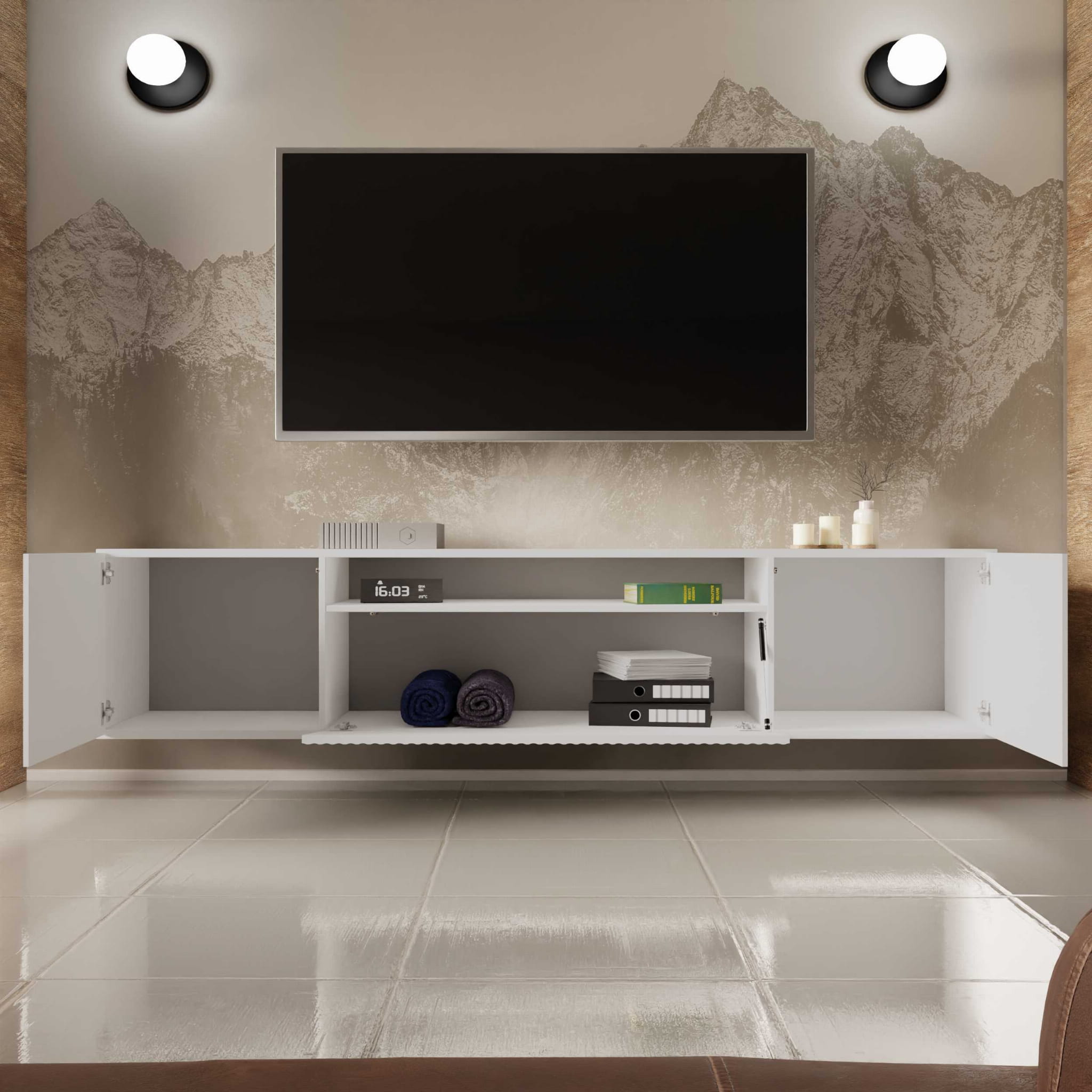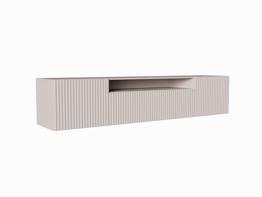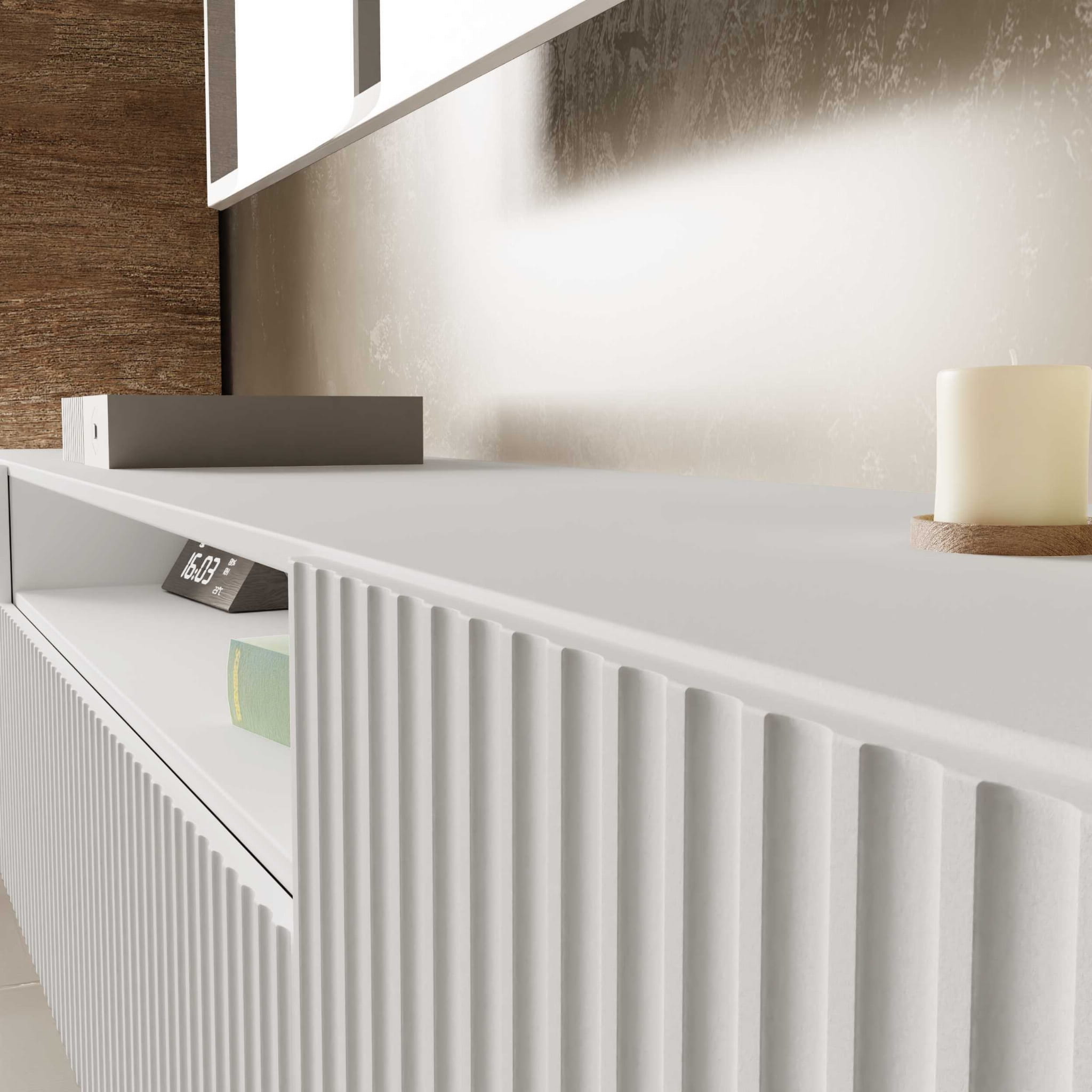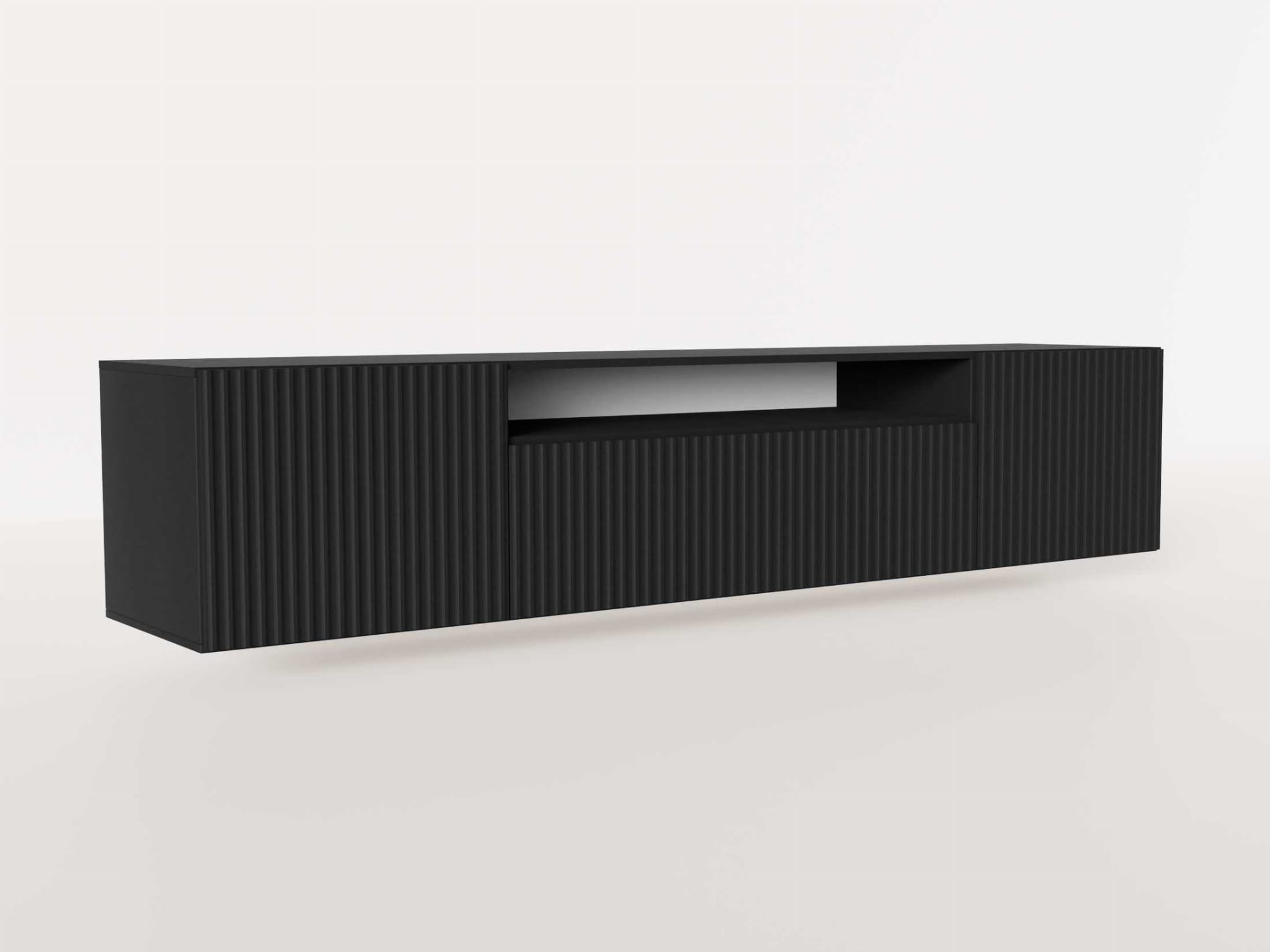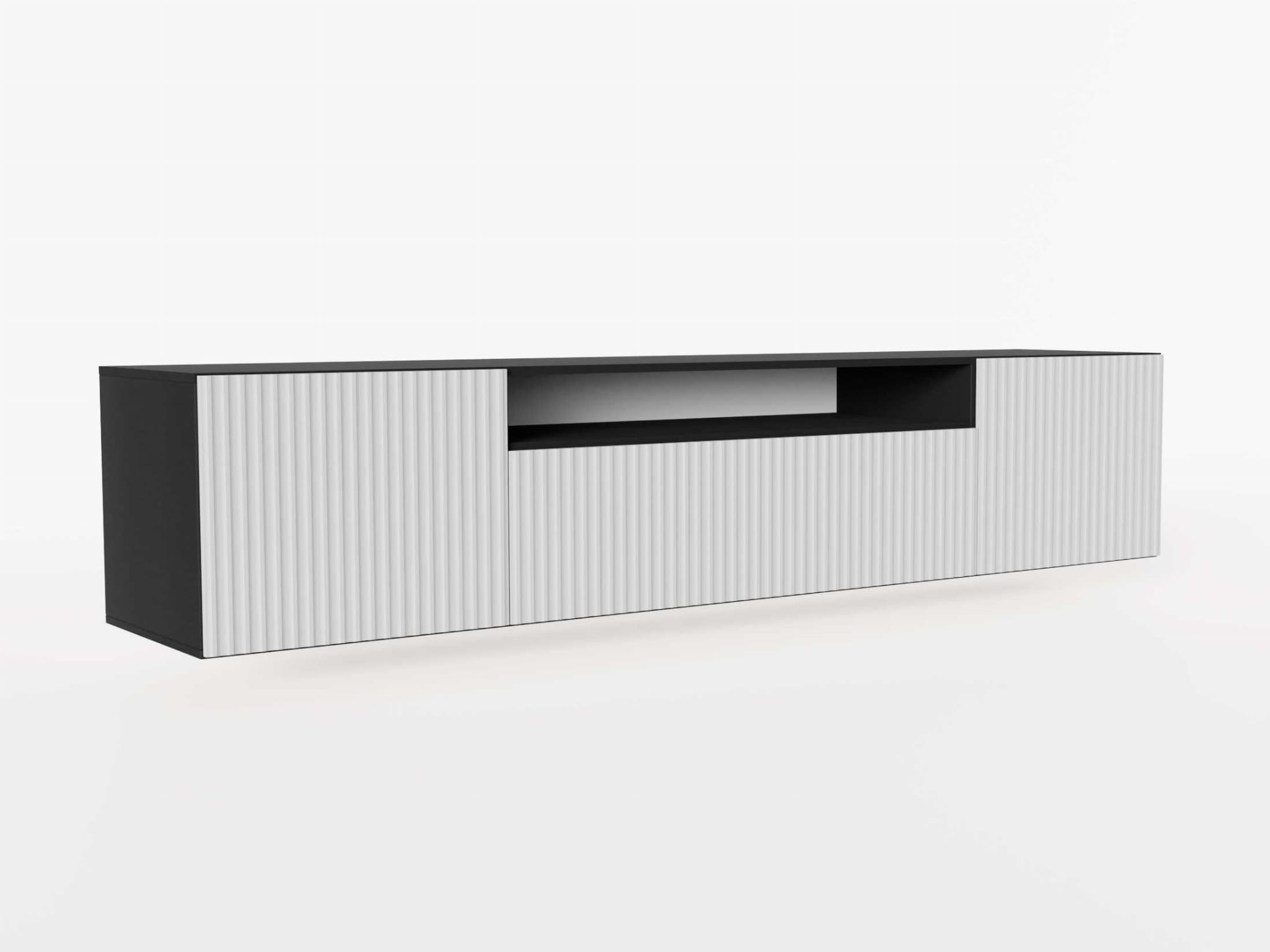 Szafka RTV Wisząca NOE Szerokość 200 cm Biała Ryflowany Front Trzydrzwiowa