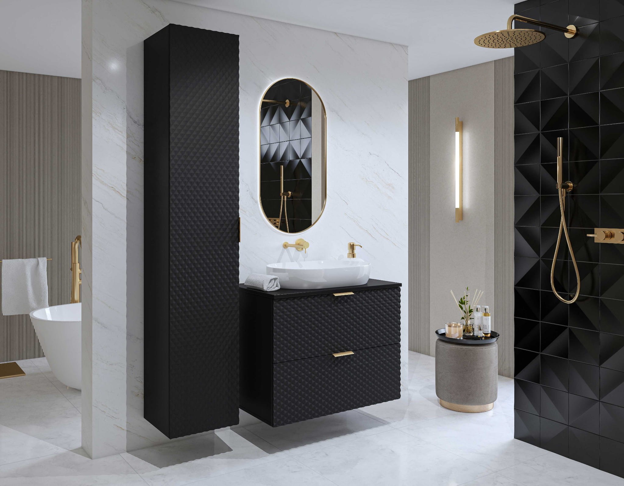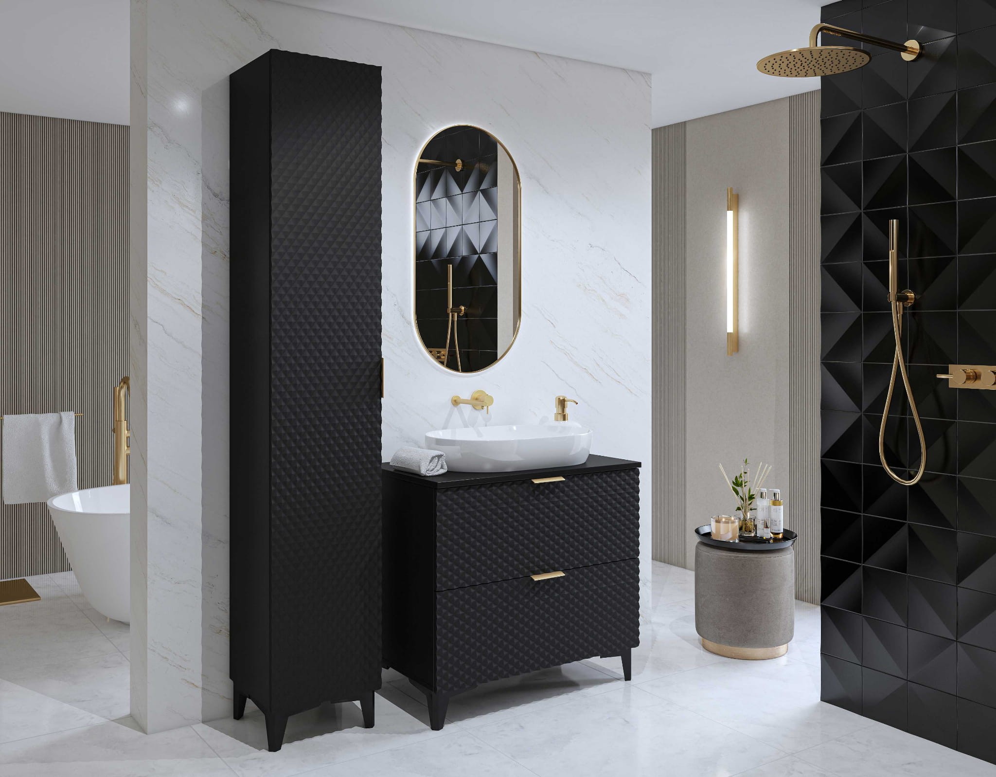 Szukasz łazienkowych mebli, które wyróżnią się elegancją, ponadczasowym stylem i funkcjonalnością? Poznaj kolekcję LAURA – wyjątkową linię mebli do łazienki, która łączy nowoczesny design z luksusowymi akcentami. Czarne lub białe fronty z ryflowaniem w kształcie piramidek, złote uchwyty oraz możliwość wyboru między wersją wiszącą lub stojącą sprawiają, że kolekcja ta idealnie wpasuje się w różnorodne aranżacje.
