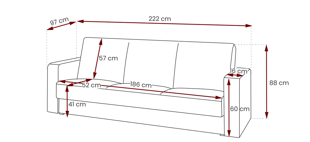 Kanapa rozkładana za pomocą systemu klik-klak. Duża powierzchnia spania 115 x 186 cm zapewnia komfortowy odpoczynek podczas całego snu.