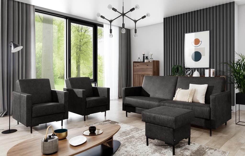 Do zestawu z wersalką Solvo można skompletować fotele i pufę. Kolekcja mebli Solvo została podzielona na wersje A, B i C, które różnią się między sobą przeszyciami. Wersja A to meble gładkie, bez przeszyć, wersja B posiada przeszycia na bokach natomiast wersja C to meble z przeszyciami na bokach i oparciu.