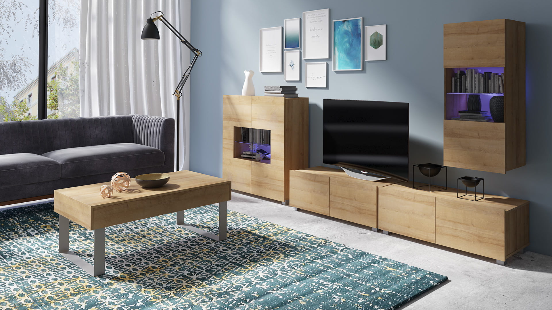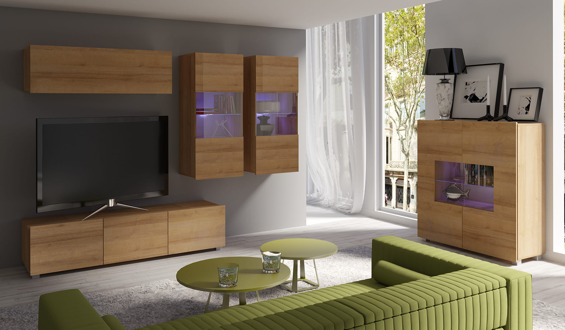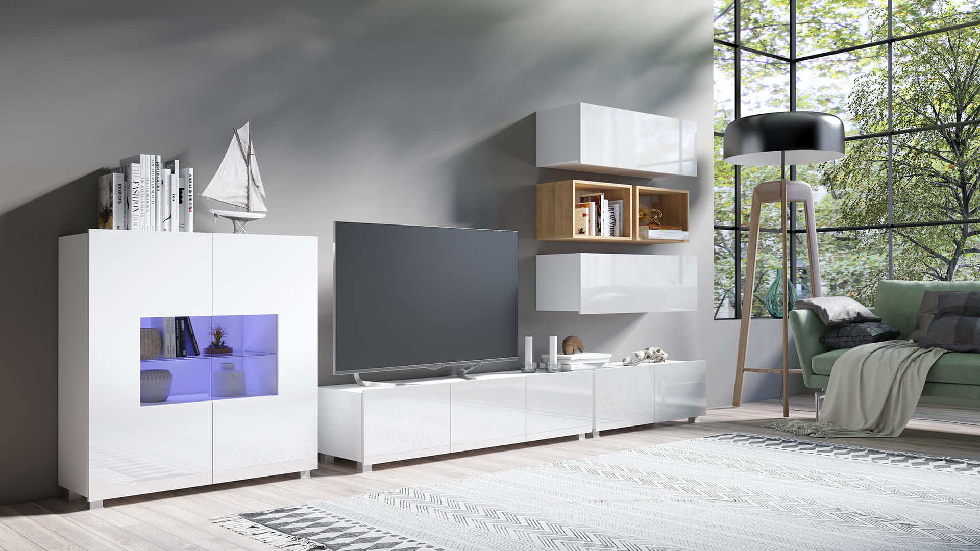 Cechą charakterystyczną prezentowanej kolekcji jest brak uchwytów w szafkach, a także możliwość swobodnego ustawienia meblościanki w zależności od indywidualnych preferencji i potrzeb.