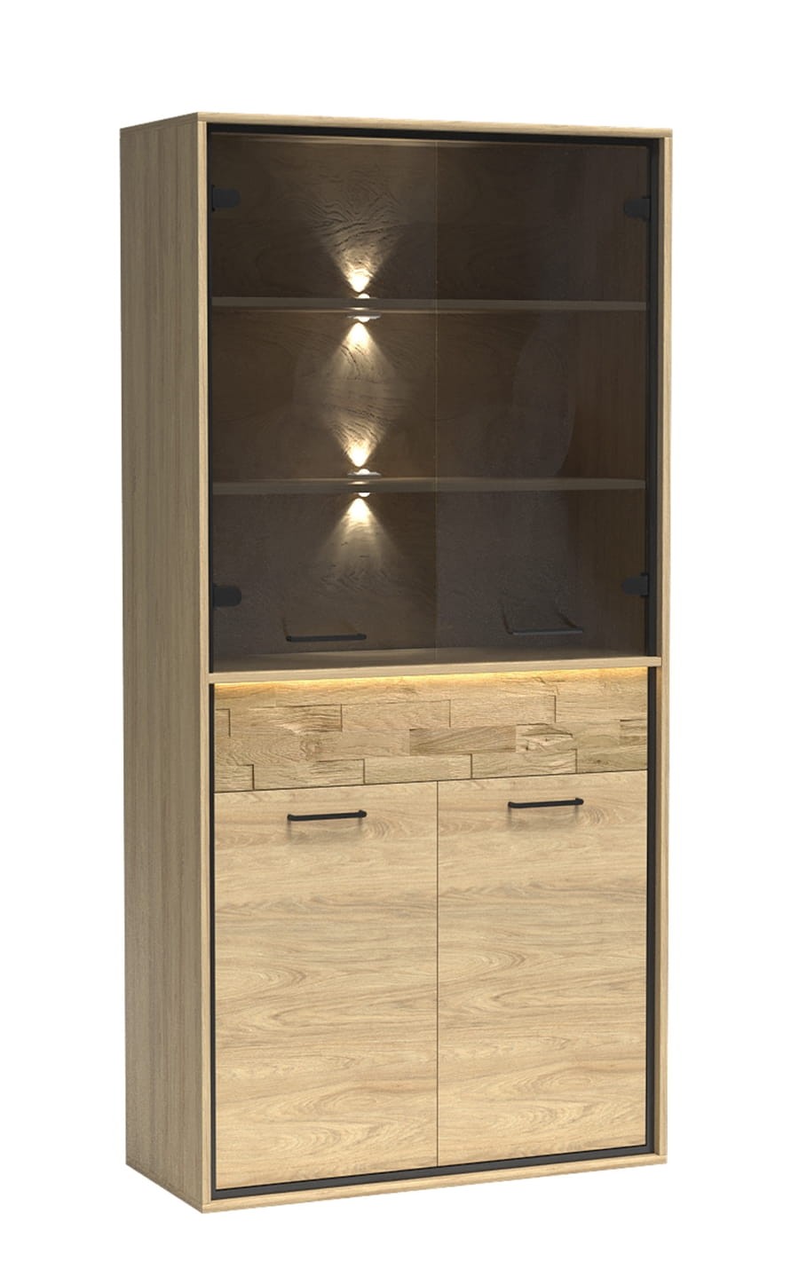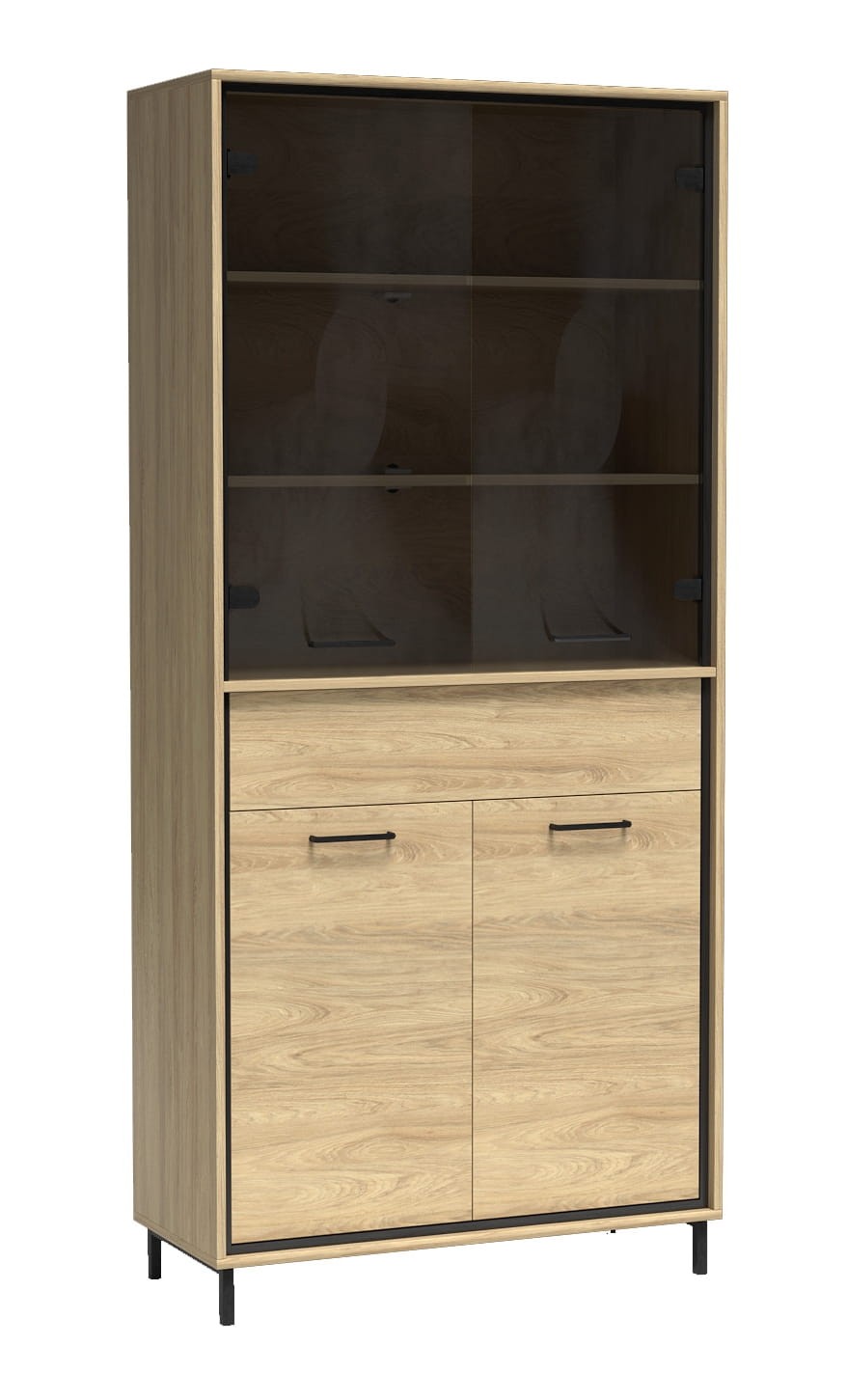 Myślisz jakie meble wstawić do jadalni? Witryna z kolekcji MEDIOLAN w naturalnym kolorze drewna hikora. Połączenie szafy dwudrzwiowej w dolnej części mebla i szklanej witryny na górze. Mebel idealnie wpasuje się w takie pomieszczenia jak jadalnia, gabinet, salon czy pokój dzienny. W jadalni doskonale wyróżni się ze świąteczną zastawą, gdy wykorzystamy opcję podświetlenia półek. Witryna pasuje do aranżacji w stylu nowoczesnym, industrialnym. Górna część szafy składa się z podwójnych frontów z przydymionego, hartowanego szkła i dwóch półek z płyty laminowanej. Dół szafy to jasne fronty z czarnymi, metalowymi uchwytami za którymi mamy do dyspozycji półkę. Nad dolną szafą znajduje się wysuwana szuflada, która otwiera się na dotyk. Wykorzystany nowoczesny system otwierania push to open. Można wykorzystać do niej dodatki takie jak czarne nogi, które będą pasować do czarnych listew i stworzą idealne zestawienie. Przód szuflady może być udekorowanych drewnianą, dębową deską. Dla lepszego efektu możemy wykorzystać oświetlenie LED półek szklanych i dekoracyjnej deski.