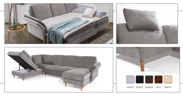 Dopełnieniem całości jest ukryty pojemnik na pościel, który ułatwia organizację tekstyliów i pomaga utrzymać ład w mieszkaniu. Wysokie nogi to również ogromna zaleta praktyczna – pod mebel swobodnie wjedzie robot sprzątający, co pozwala zachować czystość bez przesuwania mebli.