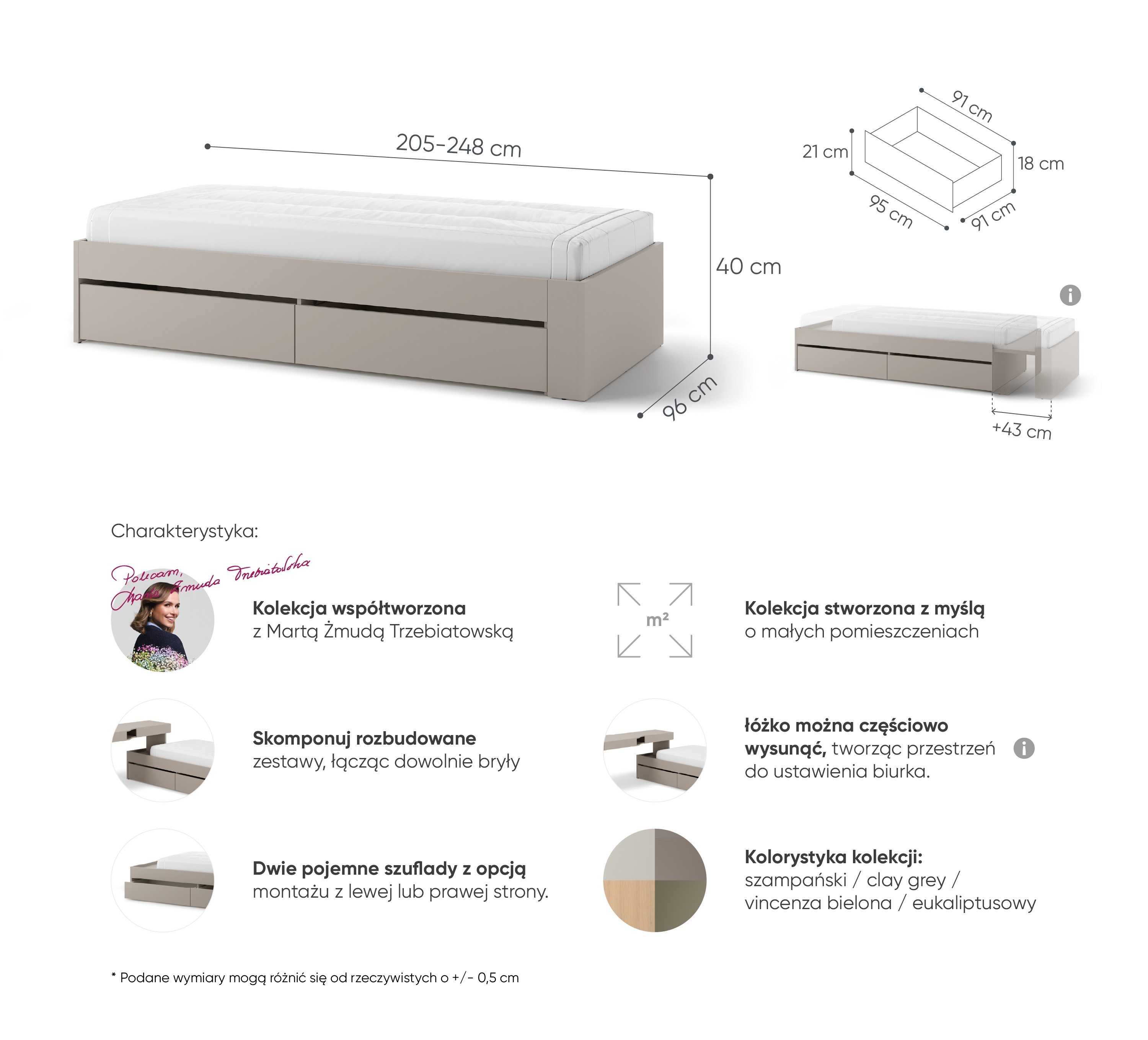 Łóżko WOOW WO-12 90 x 200 cm Rozsuwane 2-Szuflady Clay Grey WO12CG