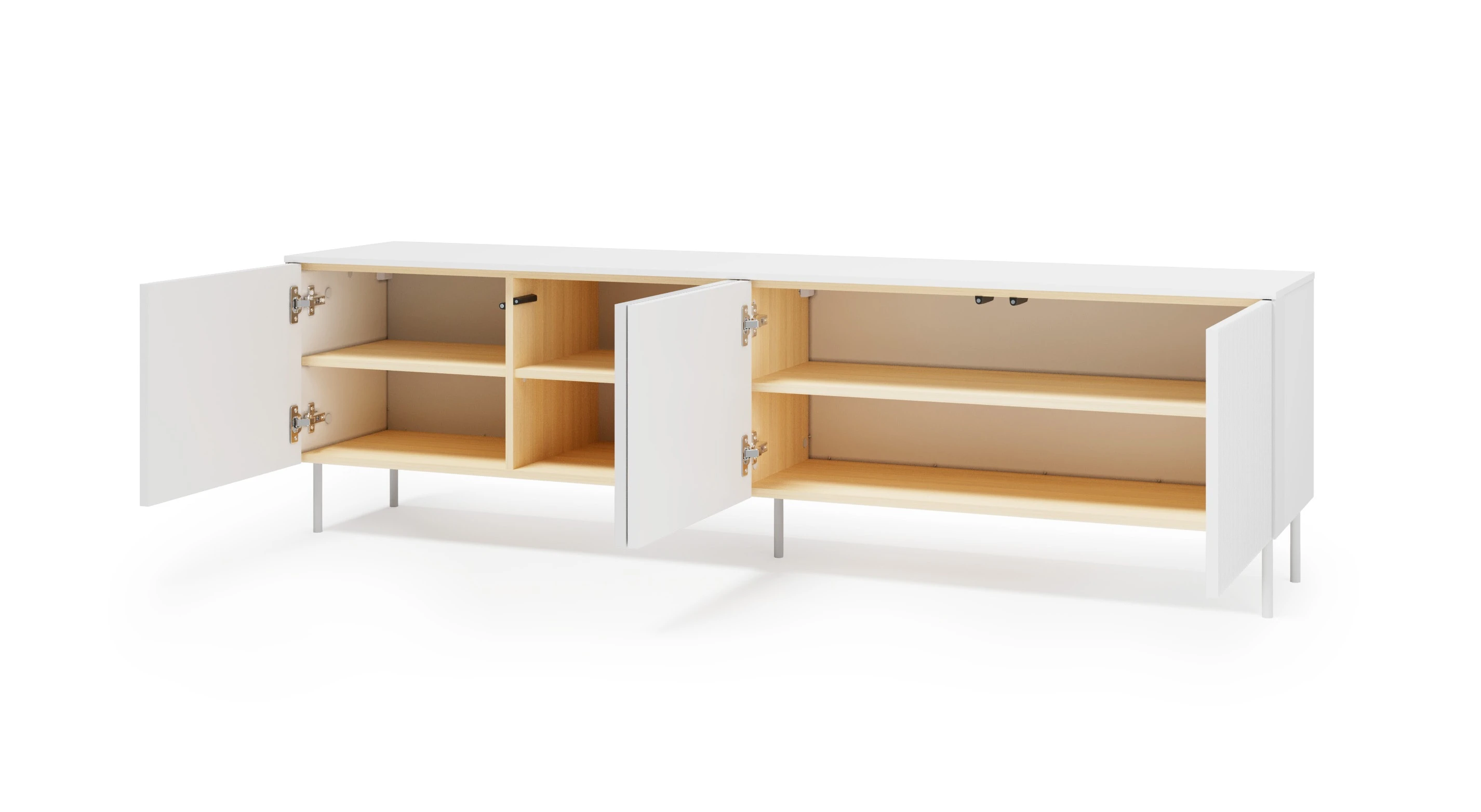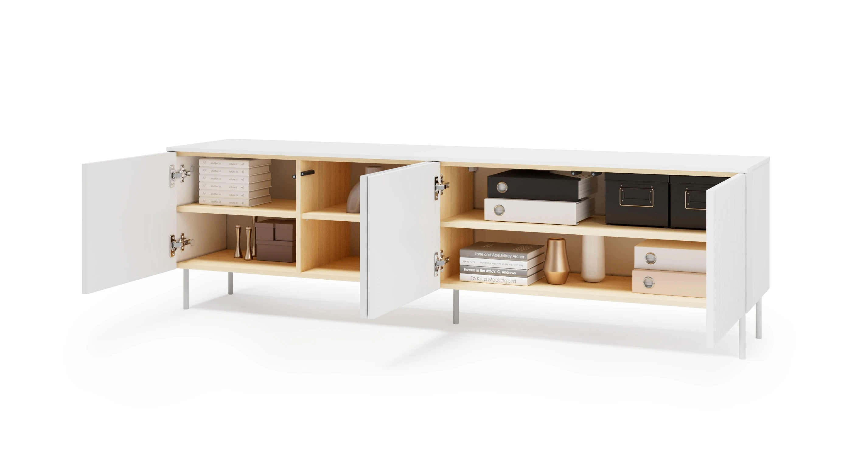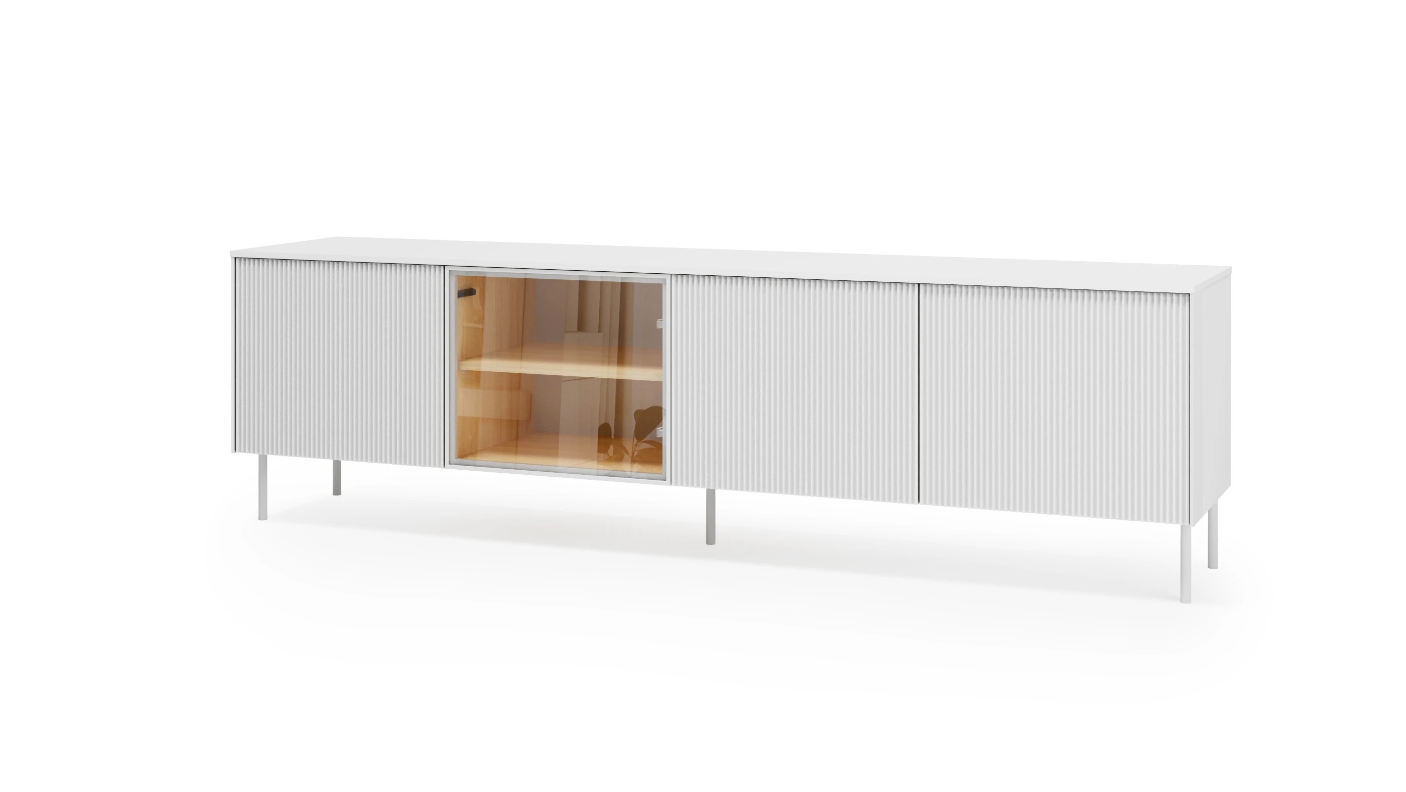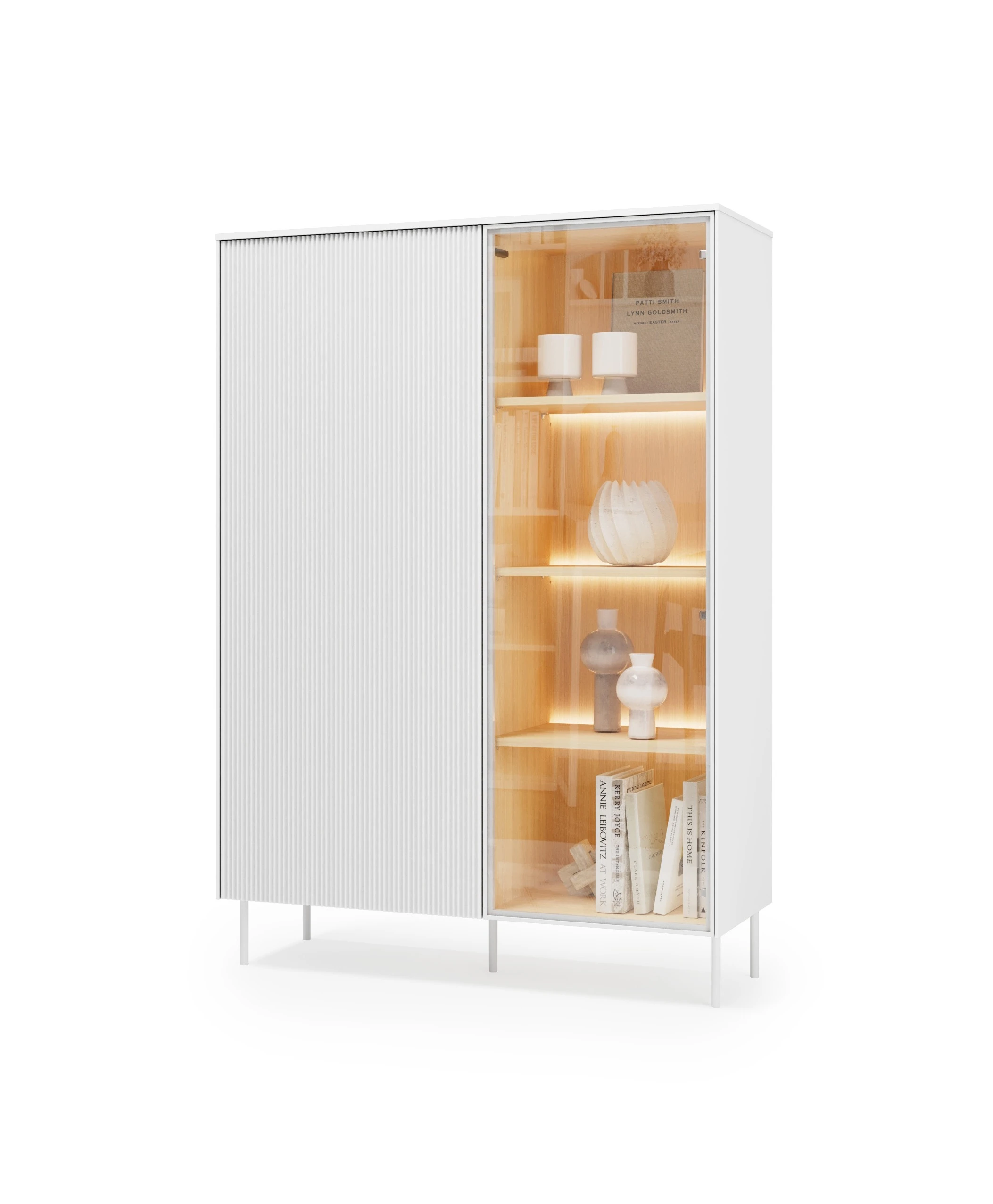Jednym z najbardziej charakterystycznych elementów kolekcji są ryflowane fronty wykonane z płyty MDF (18 mm), które nadają meblom eleganckiej struktury i wyjątkowego charakteru. Dodatkowo witryny wyposażone zostały w: