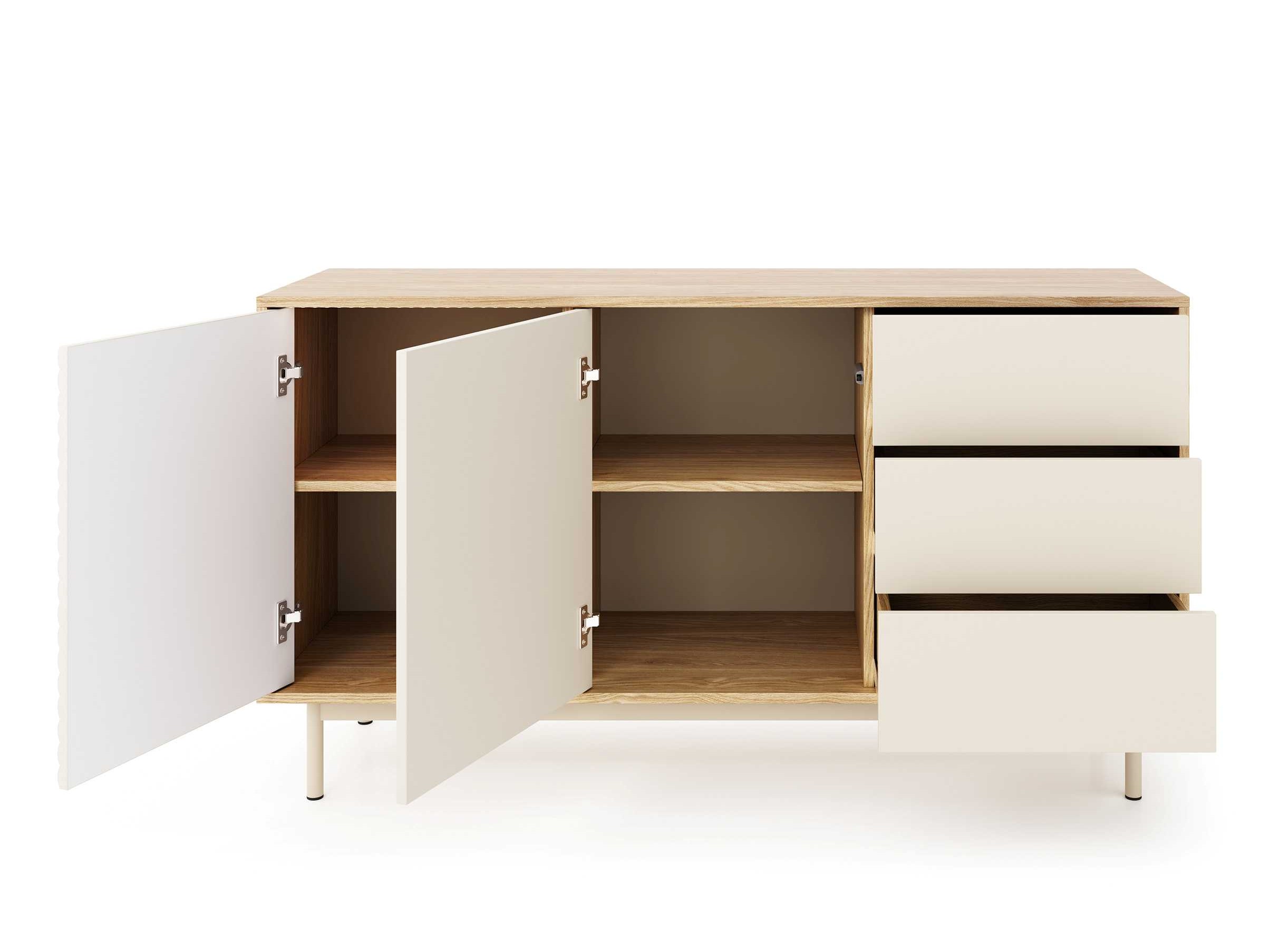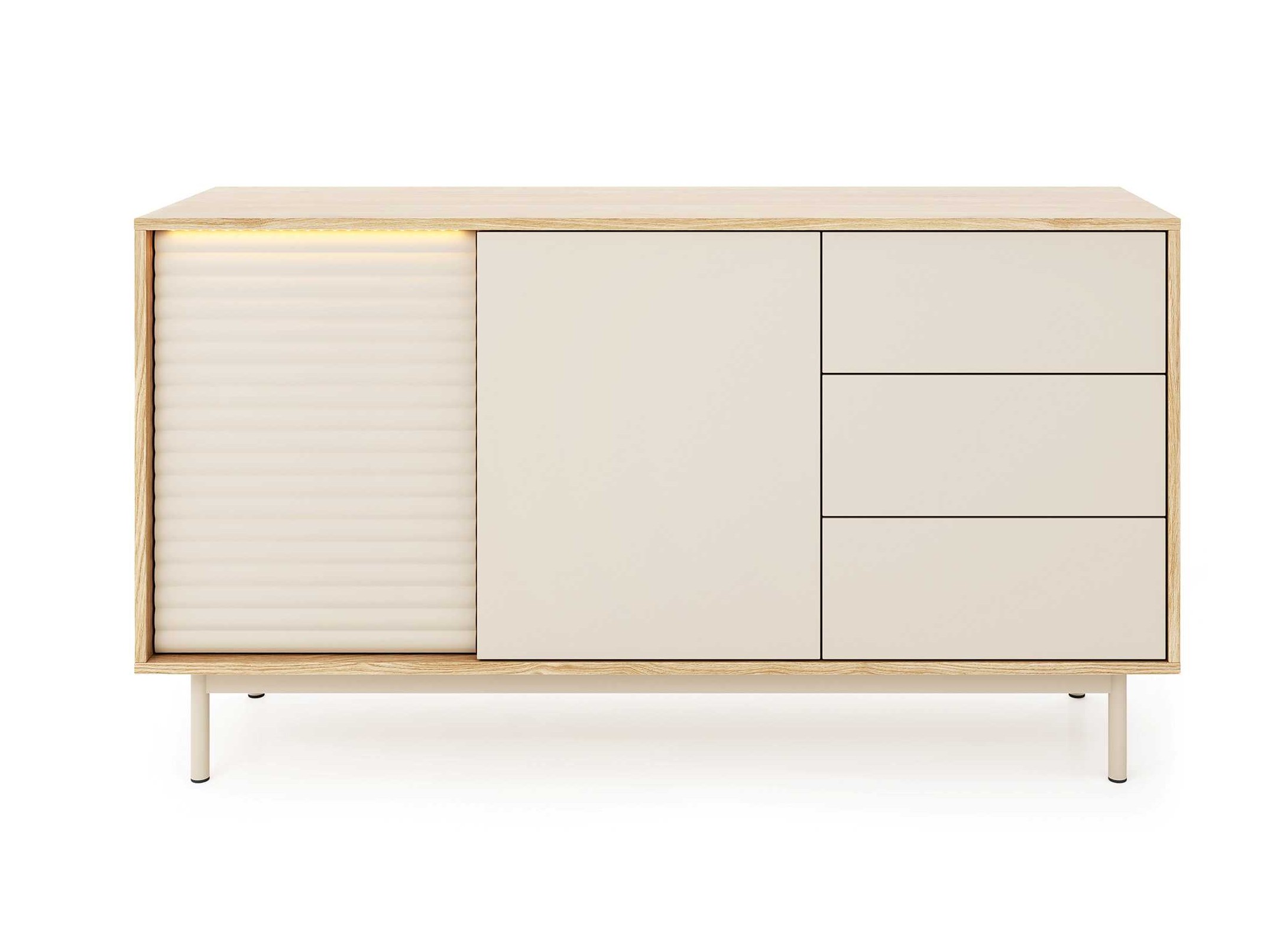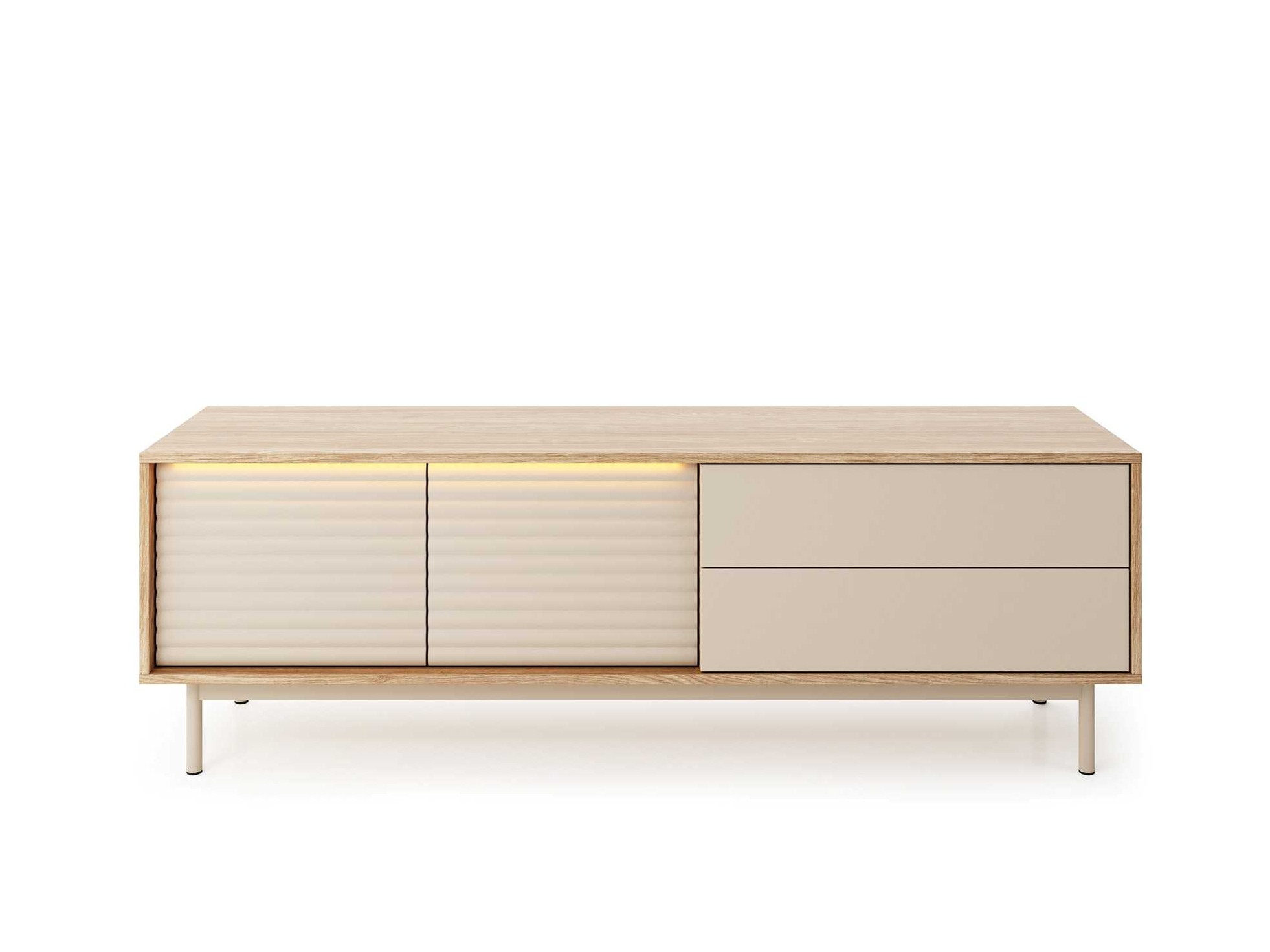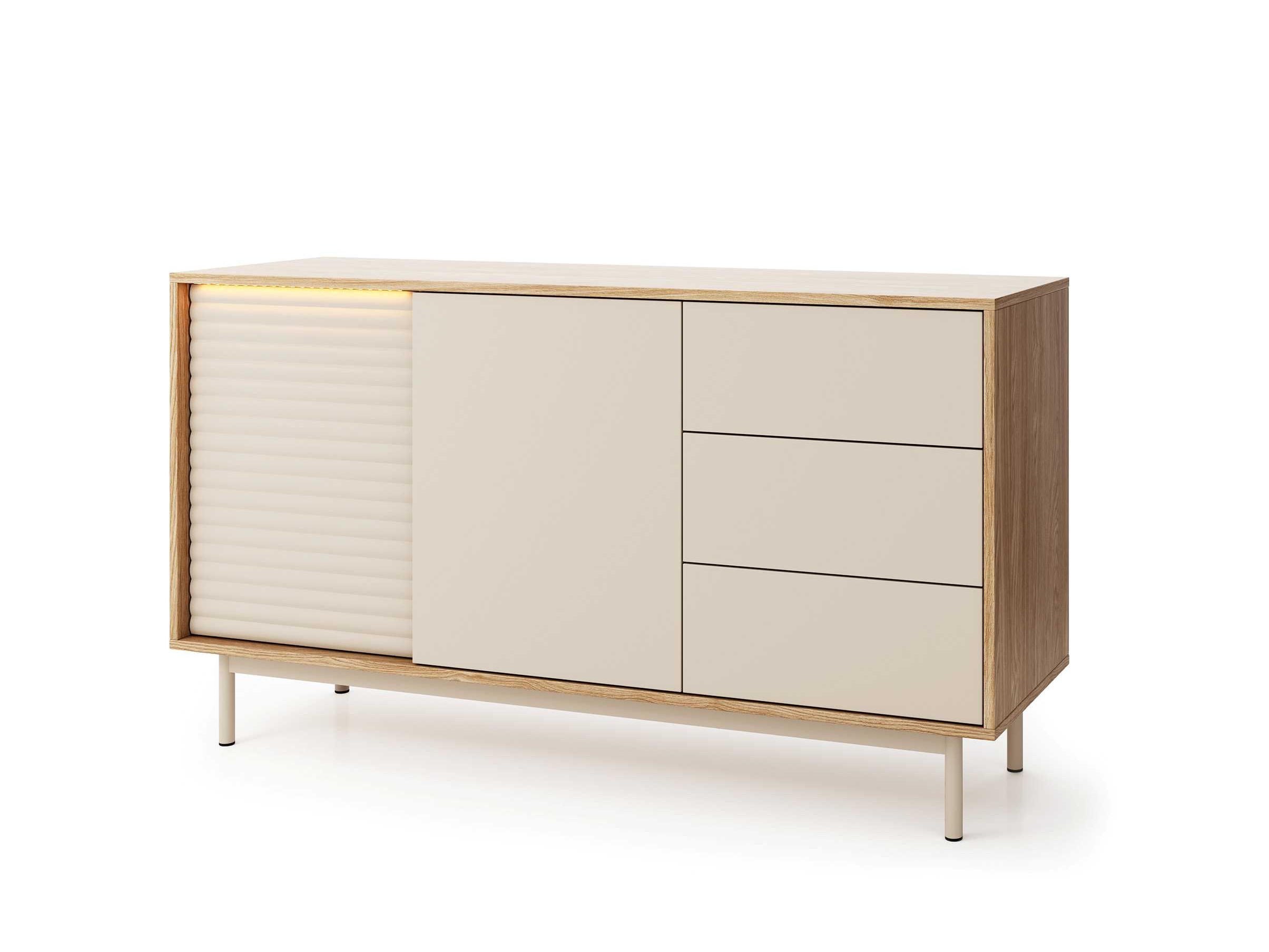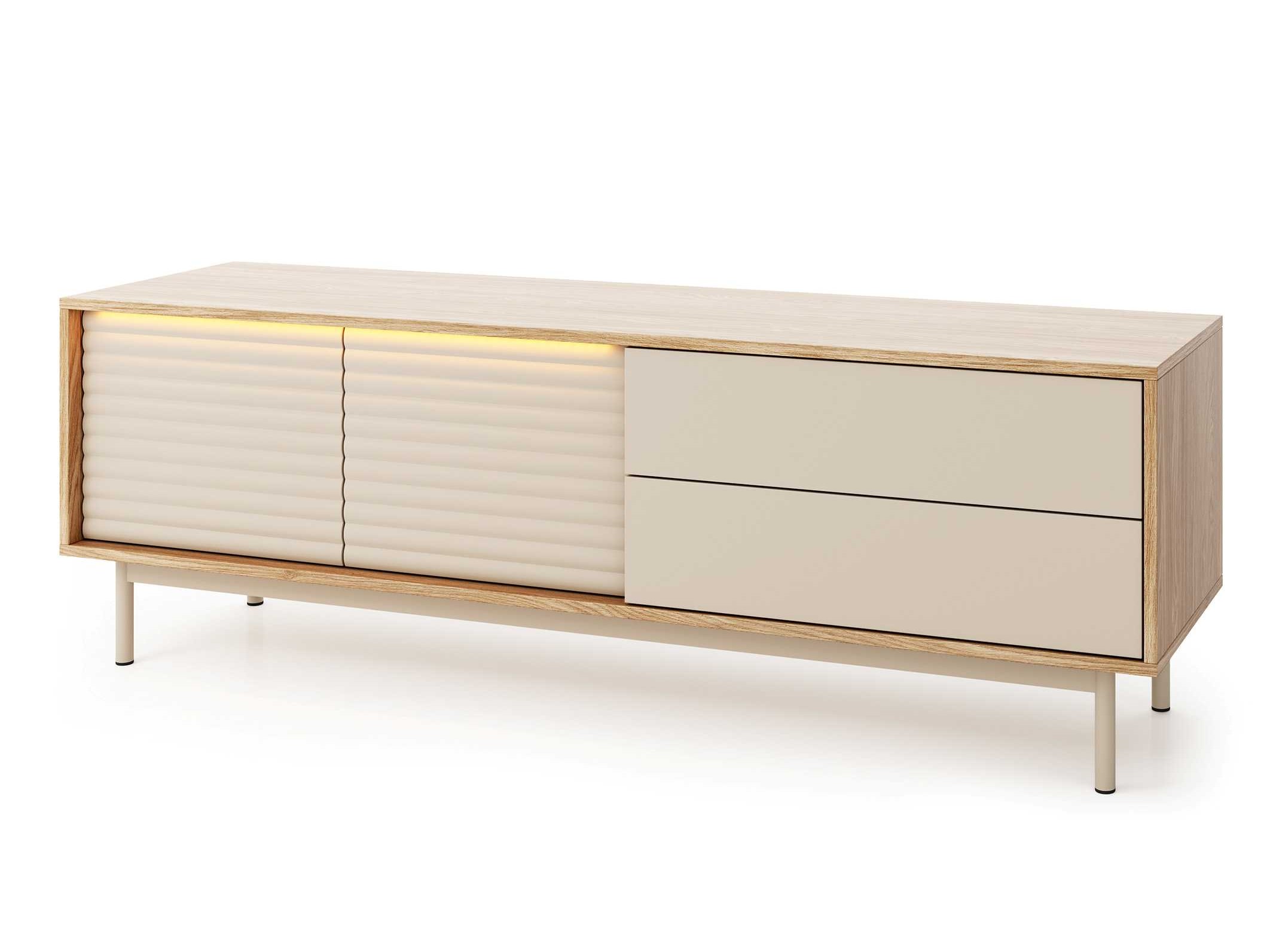 TILA to kolekcja mebli do salonu zaprojektowana z myślą o osobach, które cenią współczesny design, eleganckie detale i funkcjonalność w codziennym użytkowaniu. Połączenie kolorów kaszmiru i dębu olejowanego, ryflowane fronty oraz metalowe, wysokie nóżki tworzą wyjątkową, wyważoną całość, która odnajdzie się w nowoczesnych i przytulnych wnętrzach.