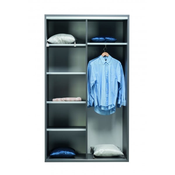 - Wnętrze: półki + wieszak na ubrania