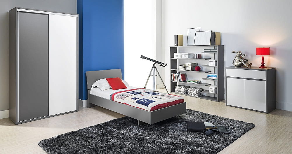 W skład systemu wchodzą: regały otwarte i zamknięte, komody, biurko, szafy przesuwne, łóżka młodzieżowe, szafka RTV i ława.