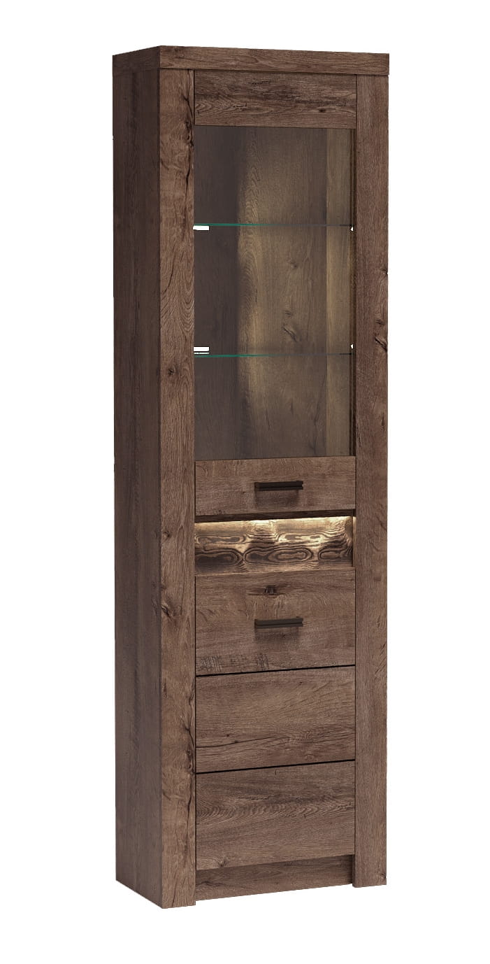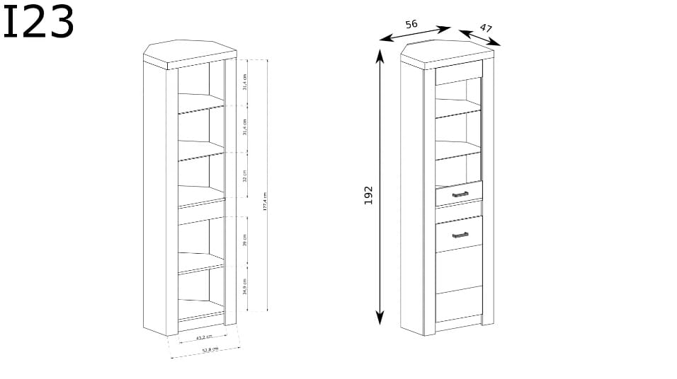 Witryna narożna z kolekcji Indianapolis, która zmieści się w każdy kąt. Posiada dwie półki za szklanym frontem, które są idealne do eksponowania wielu ozdób, książek czy zestawu porcelany. Trzecia półka znajduję się za szafką z pełnym frontem, dzieli ona przestrzeń na pół, przez co możesz wykorzystać miejsce w meblu w 100%. Metalowe uchwyty idealnie współgrają z całością. Możliwość wymienienia frontu szklanego na pełny. Dostępna w trzech wybarwieniach.